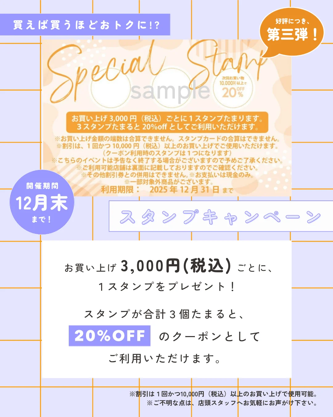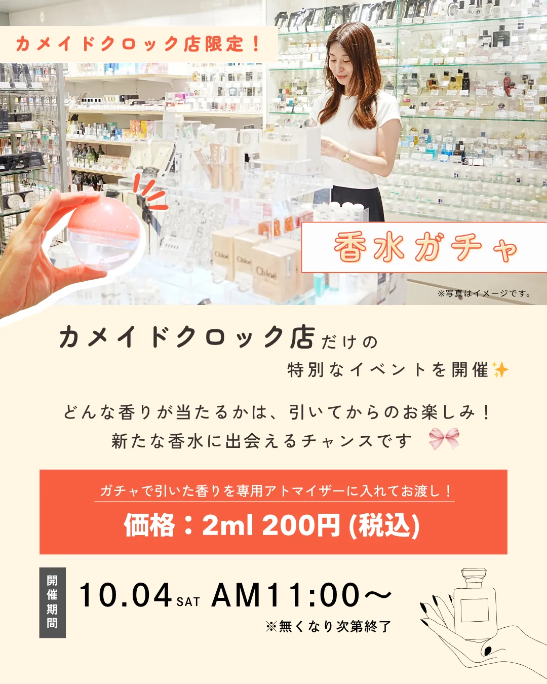 憧れのブランド香水が試せる「香水量り売りイベント」、大人気の「スタンプキャンペーン第3弾」、カメイドクロック店限定の香水ガチャなど、イベント盛りだくさん!お得な商品も満載なので要チェックです。