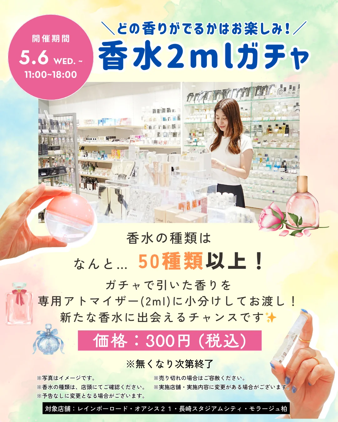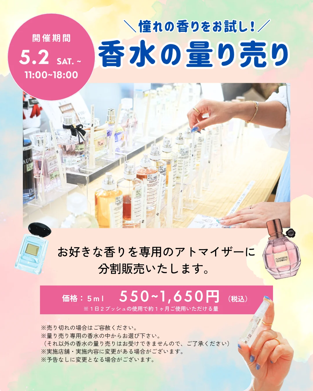 香水2mlガチャ、香水の量り売り、パンフェス、スタンプキャンペーンイベント盛りだくさん!お得な商品も満載なので要チェックです。