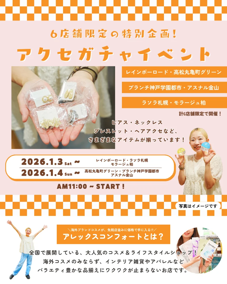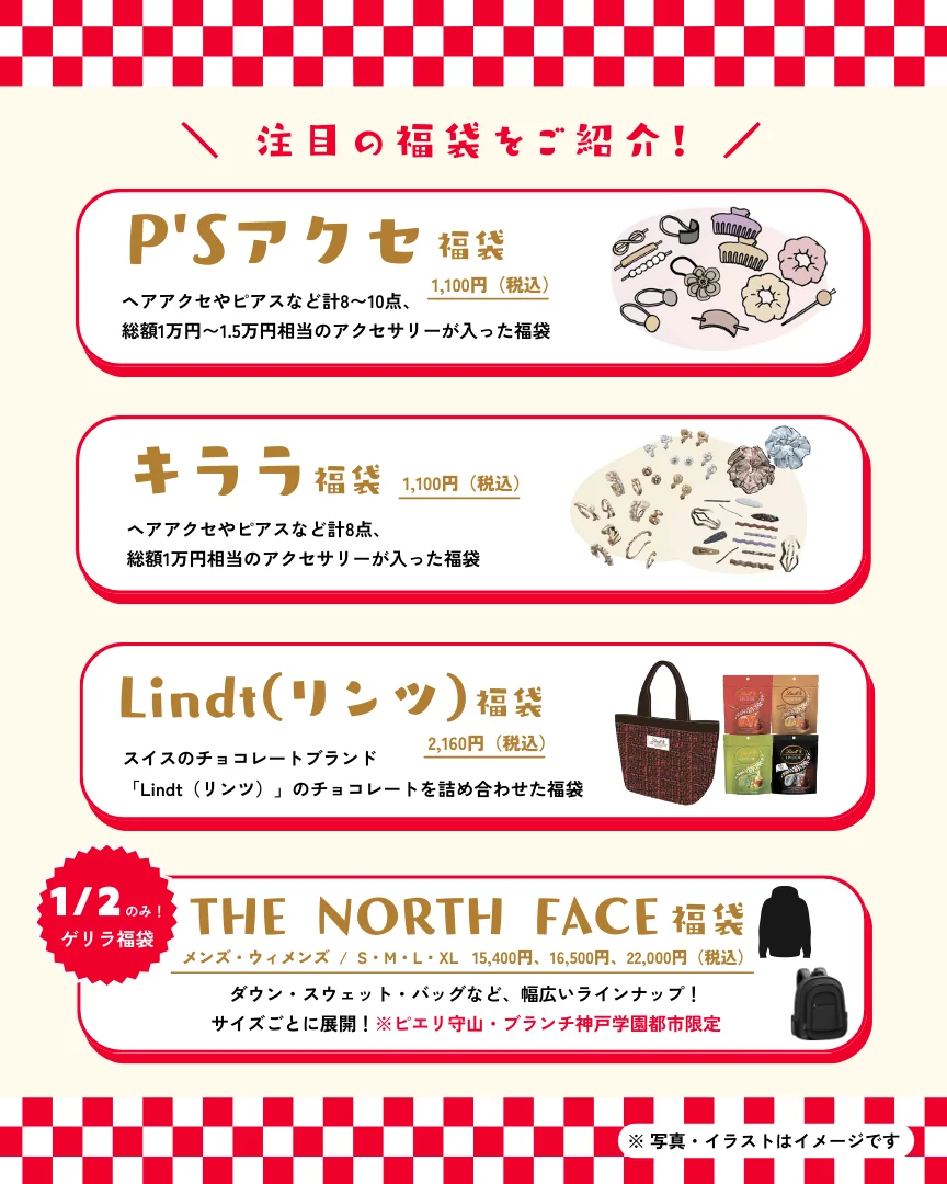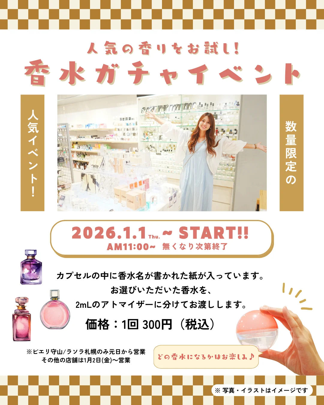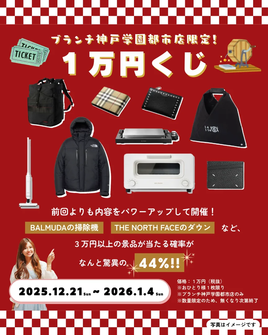 アイテム別に選べる!種類豊富な福袋、ブランチ神戸学園都市限定!1万円くじ、香水ガチャイベント、アクセガチャイベントなどイベント盛りだくさん!お得な商品も満載なので要チェックです。