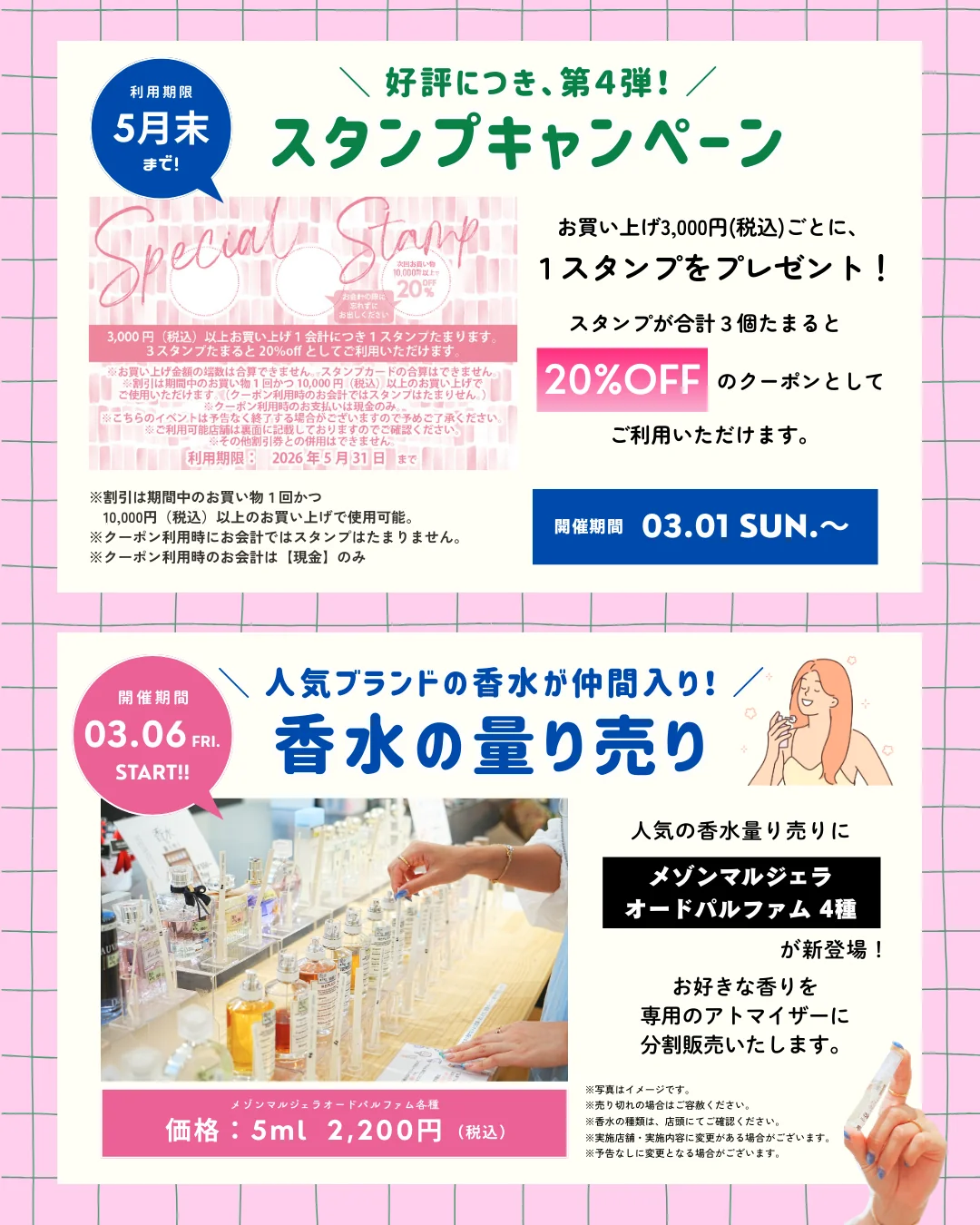好評につき第4段!「スタンプキャンペーン」、人気ブランドの香水が仲間入り「香水の量り売り」などイベント盛りだくさん!お得な商品も満載なので要チェックです。