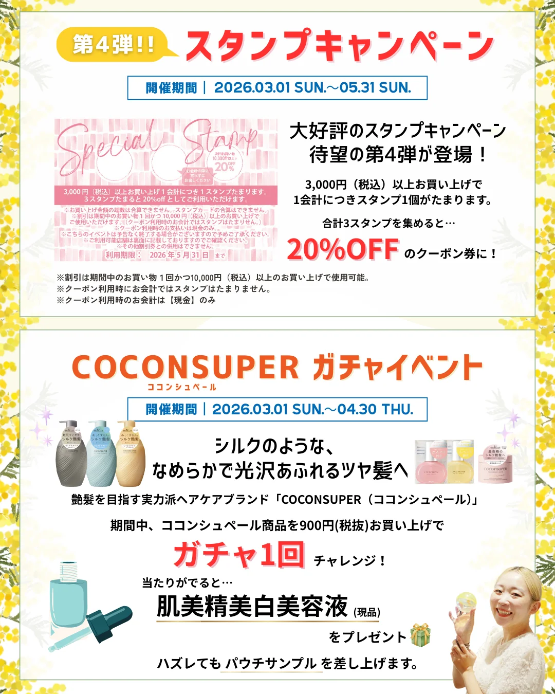 好評につき第4段!「スタンプキャンペーン」、COCONSUPER ガチャイベントなどイベント盛りだくさん!お得な商品も満載なので要チェックです。