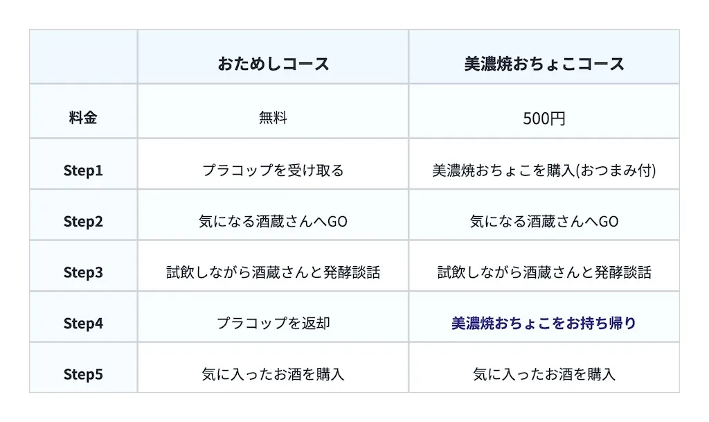 東美濃を代表する酒蔵が勢揃いします。2つの試飲コース(無料のおためしコース / 500円の美濃焼おちょこコース)で飲み比べを楽しめます。