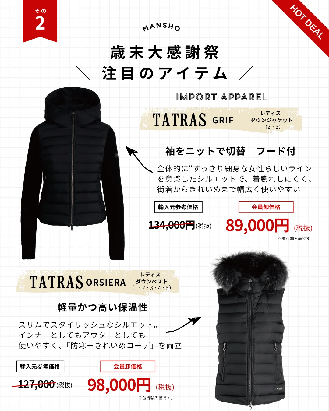 今年の感謝祭では、冬の必需品となるアウターや防寒アイテムが充実。人気ブランドのダウンジャケットにダウンベストなど、この時期に嬉しいアイテムが勢揃いです。