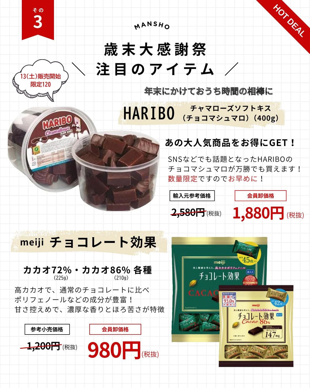 お買い物ついでに嬉しいおやつ系もラインナップ。SNSで話題のチョコマシュマロや人気のチョコレート菓子など、年末年始のストックにもぴったりのアイテムが並びます。