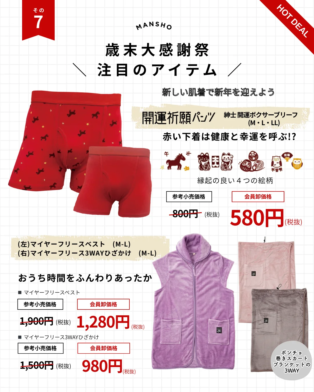 洗える羽毛布団のほか、気軽に使えるフリースベストや3WAYひざかけ、運気アップが期待できる“開運祈願パンツ”まで、冬の暮らしに嬉しいアイテムが揃っています。