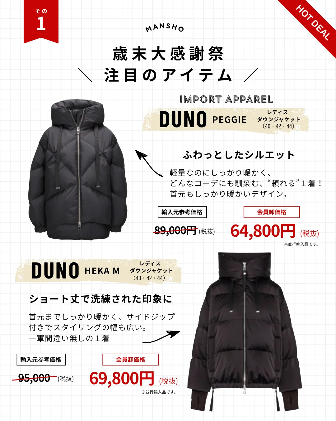 今年の感謝祭では、冬の必需品となるアウターや防寒アイテムが充実。人気ブランドのダウンジャケットにダウンベストなど、この時期に嬉しいアイテムが勢揃いです。