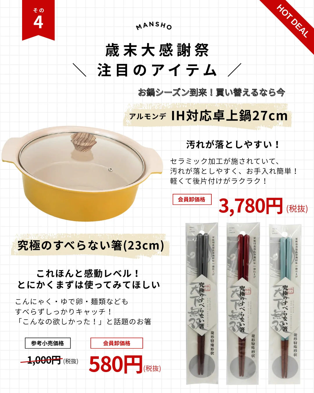 年末年始の食卓で活躍する卓上鍋や、料理がしやすくなる名脇役アイテム、さらに大掃除や日々の暮らしを整えてくれる便利グッズまで、“あると嬉しい”キッチン&生活アイテムがまとめてお得に手に入ります。
