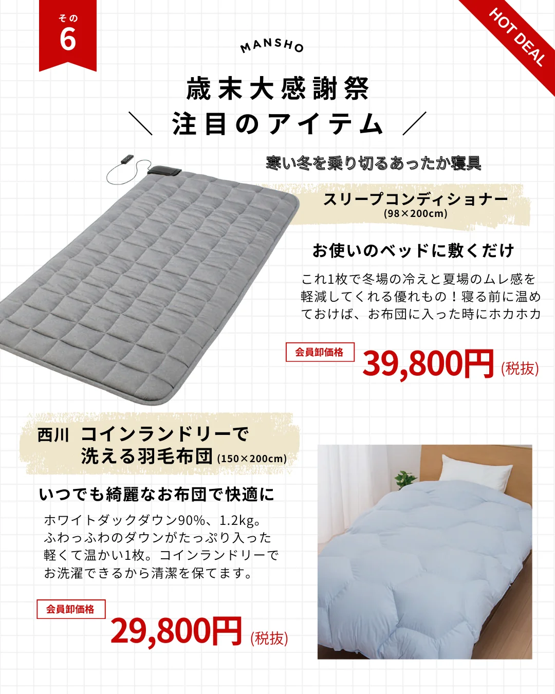 洗える羽毛布団のほか、気軽に使えるフリースベストや3WAYひざかけ、運気アップが期待できる“開運祈願パンツ”まで、冬の暮らしに嬉しいアイテムが揃っています。