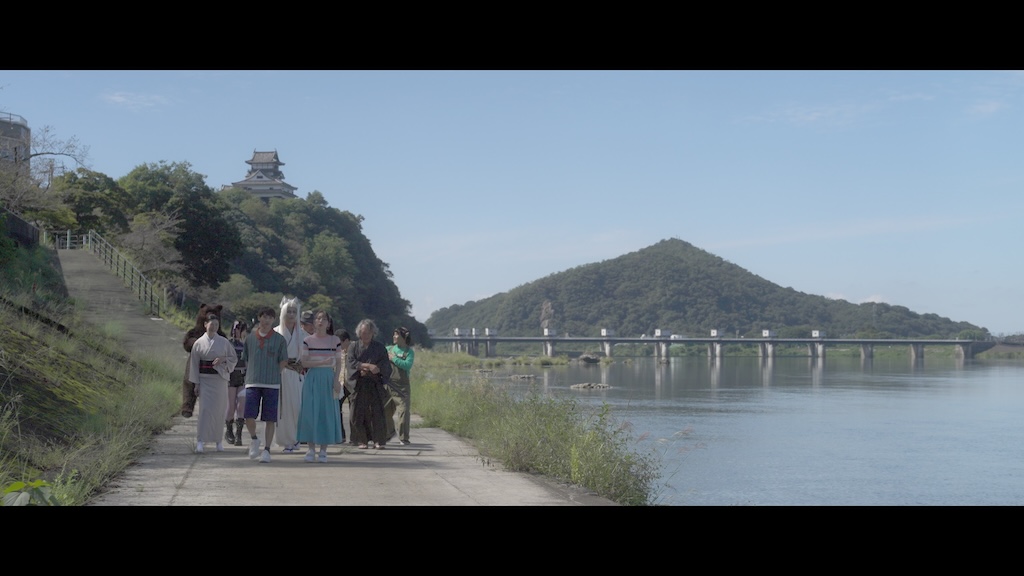▲ 木曽川沿いを歩くキャストたち。背景には国宝・犬山城が見える。