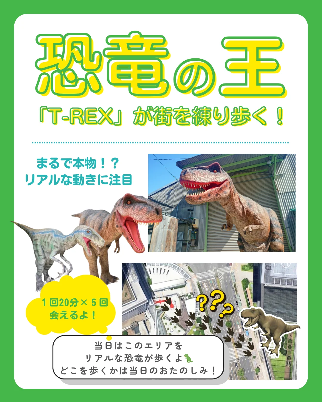 今年の最大の目玉は、なんといってもリアルな恐竜ウォーキング。T-REXをはじめとするリアルな恐竜が実際に名古屋駅周辺エリアを練り歩きます。