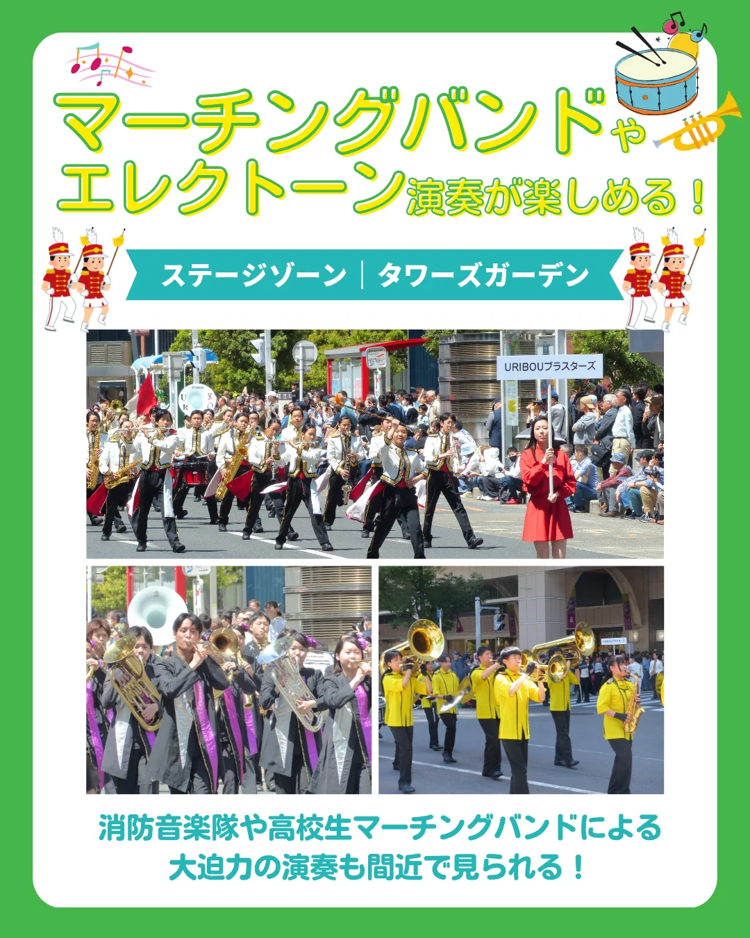 地元の学校やブラスバンド団体による迫力の演奏パフォーマンスが繰り広げられる「Aゾーン(タワーズガーデン)」と、恐竜ゲームや縁日出店が集まる「Bゾーン(ナナちゃんストリート)」の2エリアで構成。入場・参加はすべて無料なので、家族みんなで気軽に楽しめます。