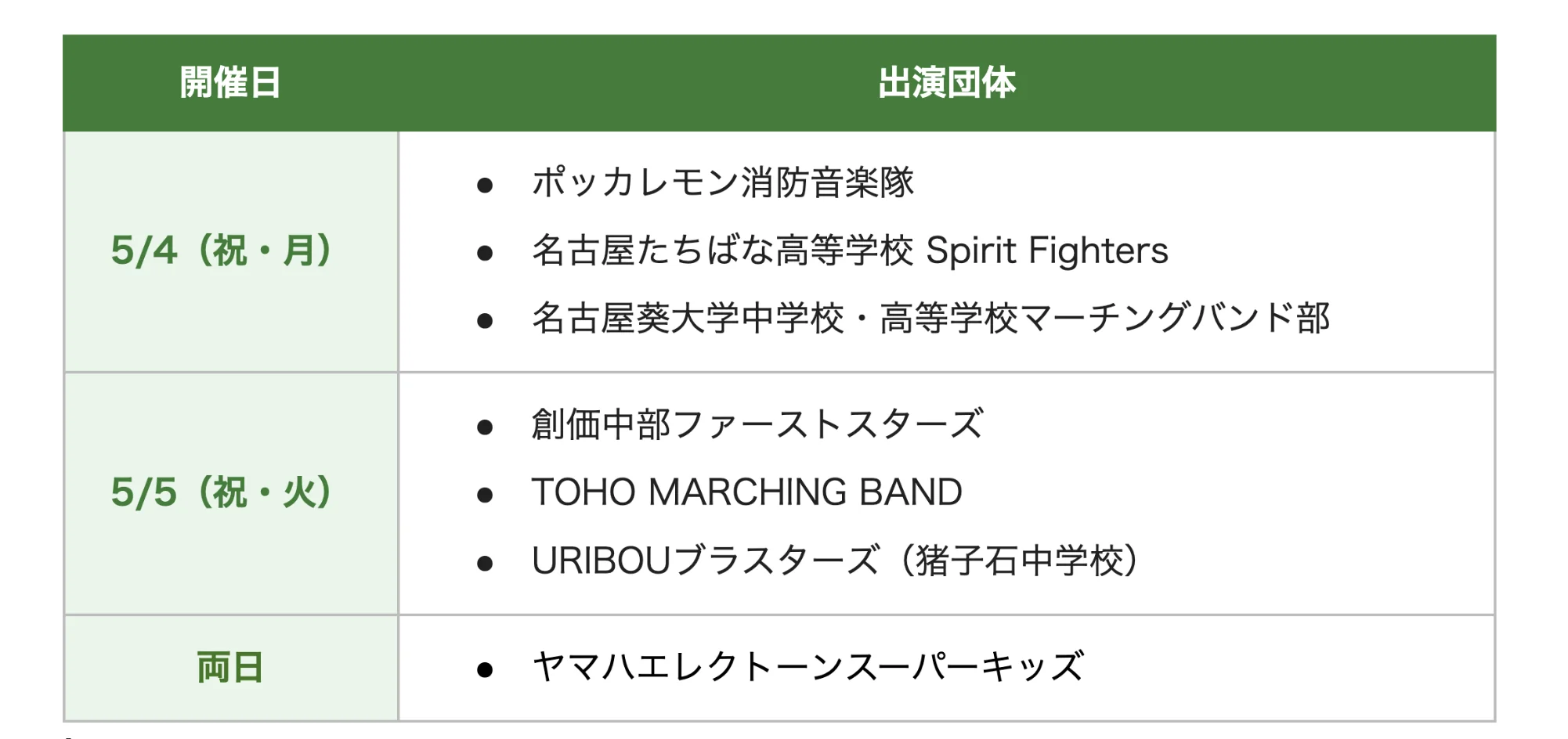 今年のAゾーンには、愛知・名古屋を代表するブラスバンド・吹奏楽の団体が集結。各団体の個性あふれるパフォーマンスをお楽しみください。