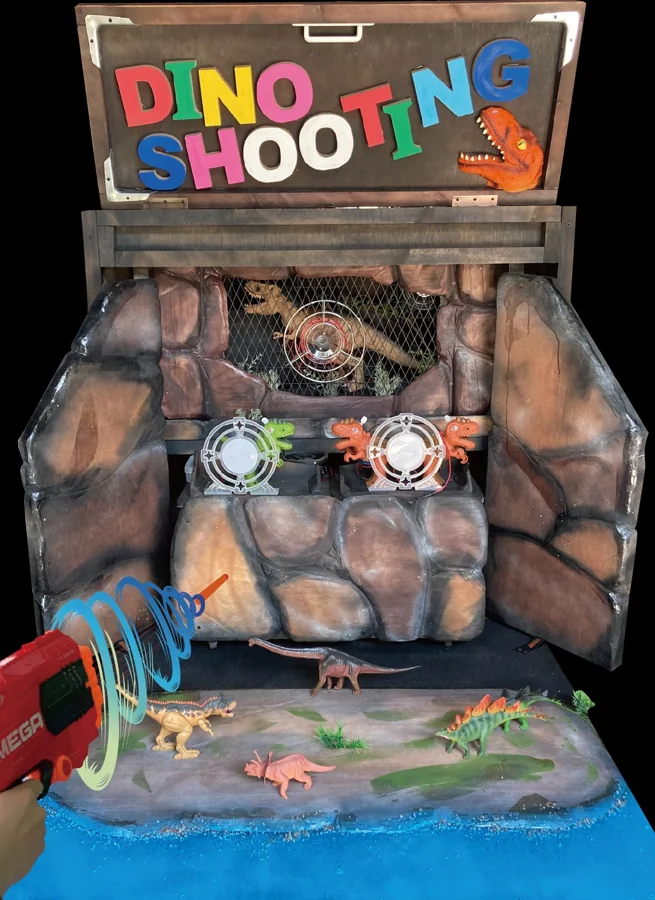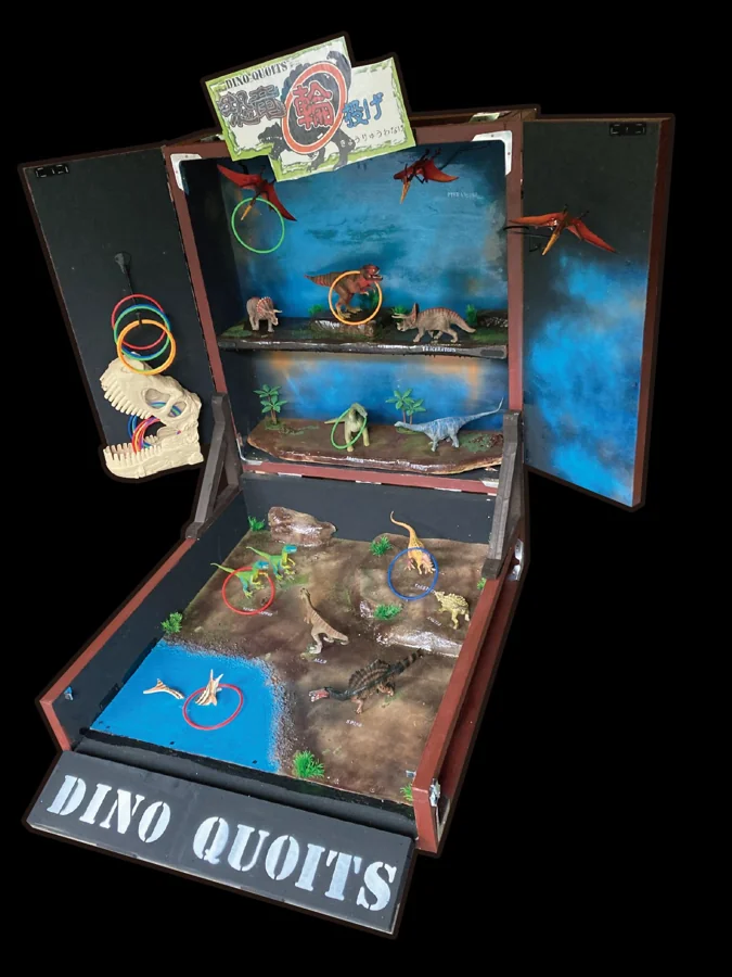 リアルな恐竜フィギュアが並ぶ立体ジオラマに向かって輪を投げる、進化版・輪投げゲーム。ヴェロキラプトル、トリケラトプス、スピノサウルス、プテラノドンなどおなじみの恐竜たちがターゲット!遠くの恐竜ほど高得点で、難易度によって挑戦のしがいも変わります。子どもから大人まで本気になれるゲームです。