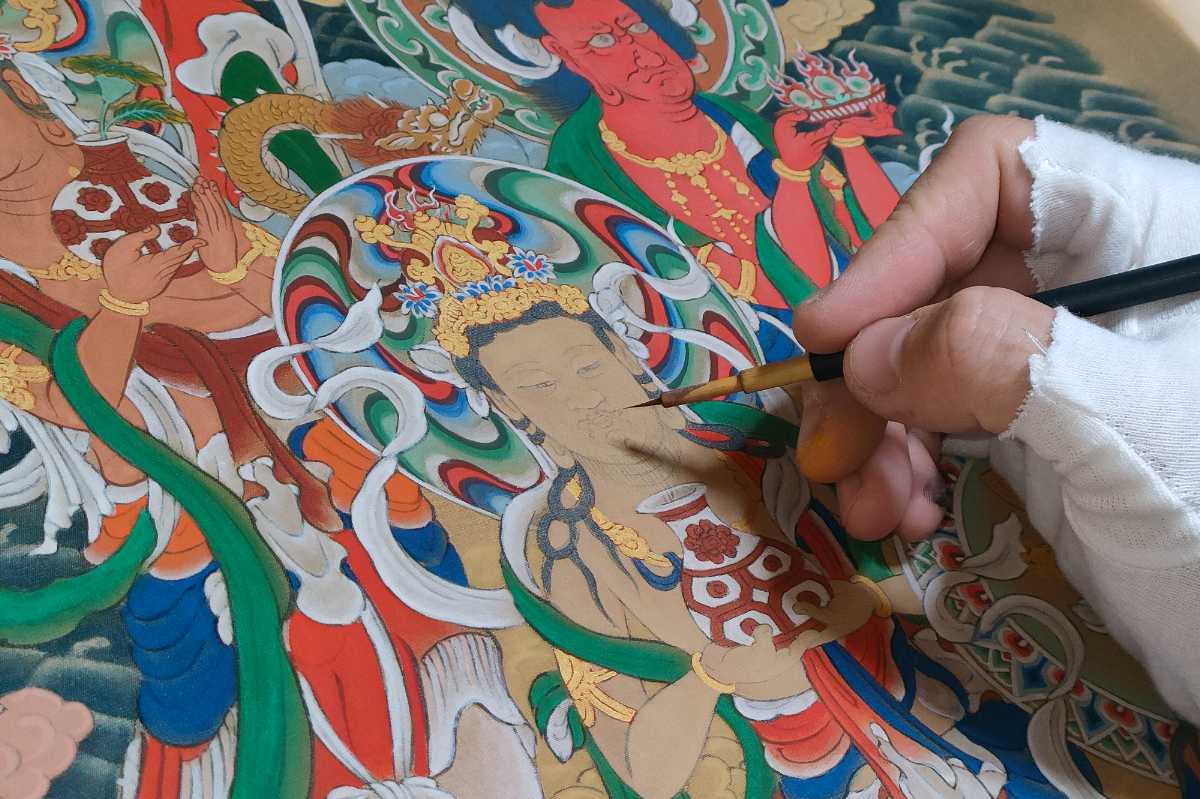 彩色師・中川次郎が主宰する「八平」では、神社仏閣の建造物 や仏画を彩る伝統技術「彩色」が行われています。天然の顔料 を使い、文化財修復や社寺の壁画制作などを手がける工房で す。来年の干支・馬を描いた絵馬に、彩色をほどこす体験を開 催。思い思いの色を重ね、世界にひとつの絵馬を仕上げます。