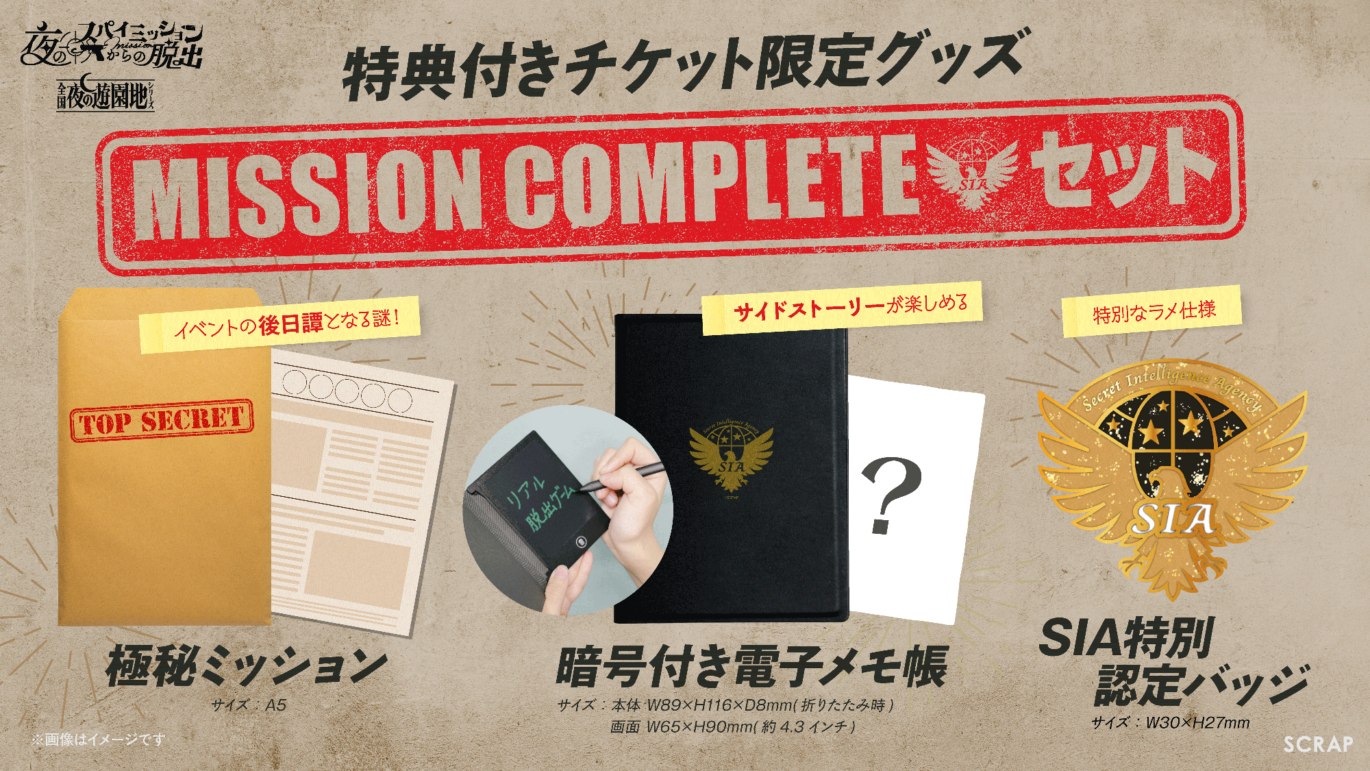 丸一日チケットまたは夜公演チケットを前売で購入すると、+3,000円(税込)で限定グッズ「MISSION COMPLETEセット」付きに変更可能