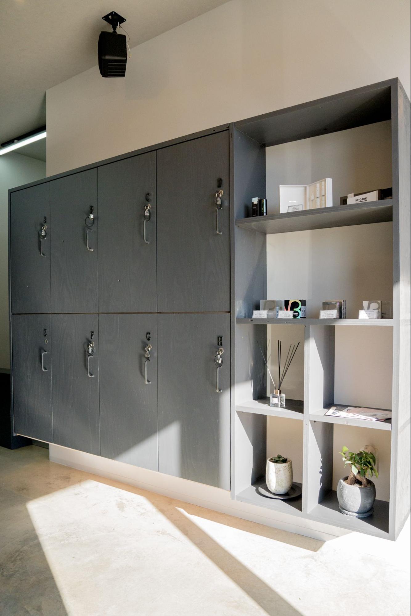 中根さん:「実は、レセプションカウンターとロッカーは以前の店舗で使われていたものをリメイクしています。もともとは白いカウンターだったのですが、色や素材を変えて全体の統一感を出しつつ、新店舗の雰囲気に合わせました。また、ロッカーもグレーに塗り直して、見た目をスマートに整えることで、もともとの良さを活かしながらアップデートしています。