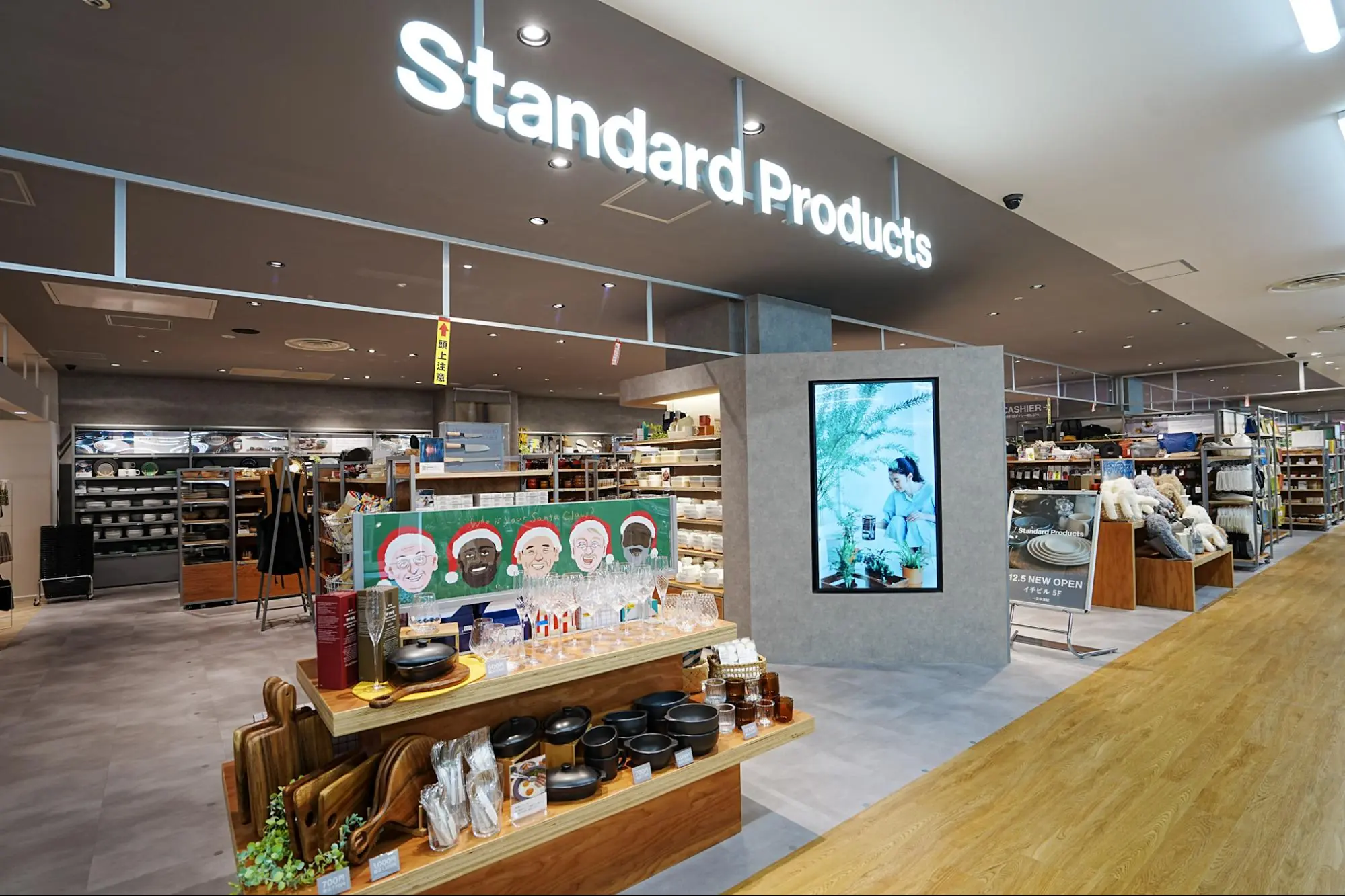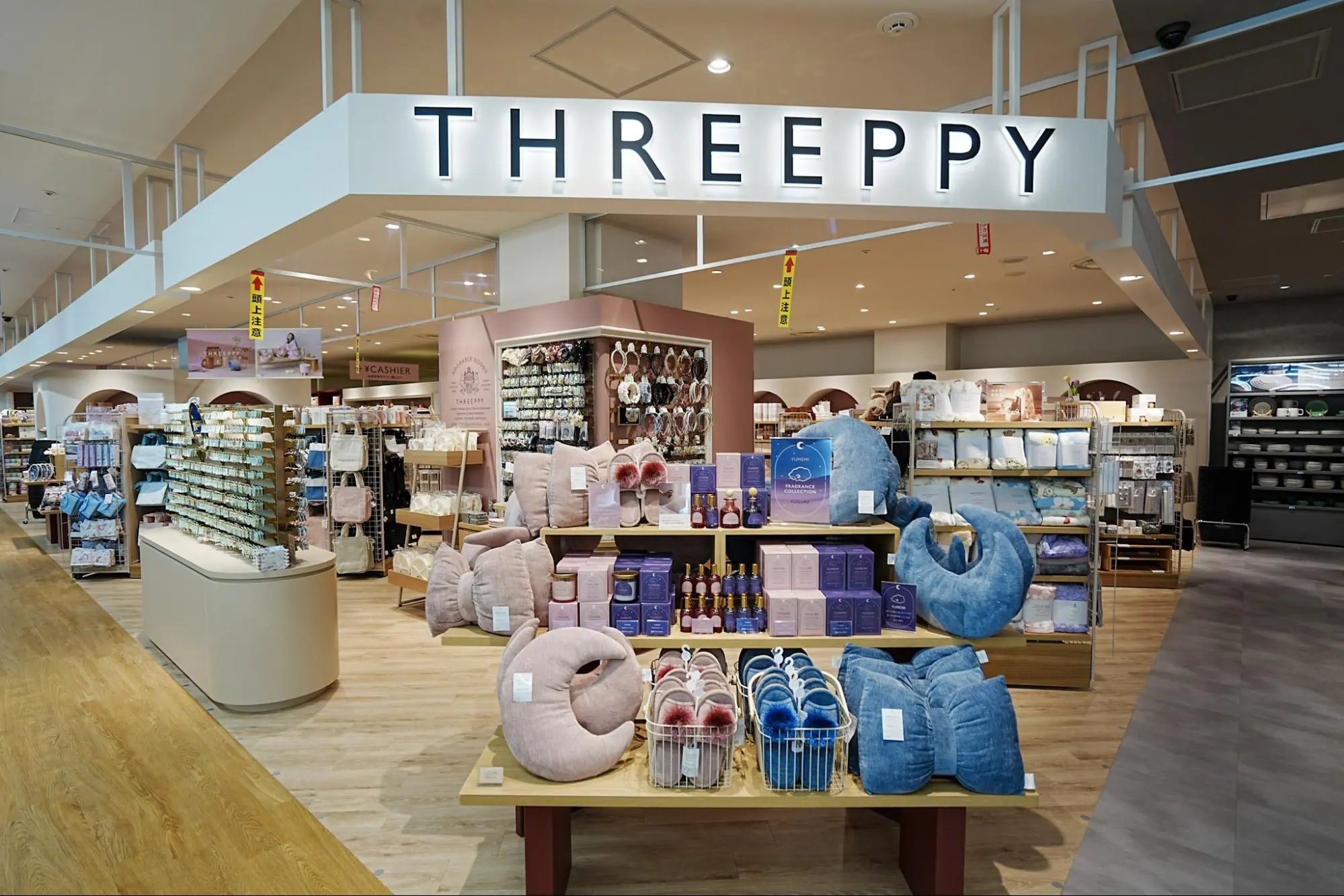 暮らしを楽しくするアイデアあふれる日用品を扱う 「DAISO」、シンプルなデザインで質や使い勝手にこだわった「Standard Products」、大人可愛いを追求する300円ショップ「THREEPPY」と、異なる3ブランドが1フロアに。