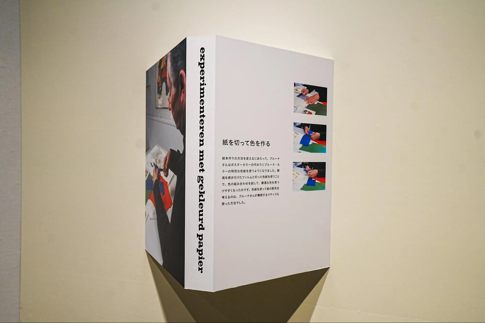 ブルーナさんの絵本は「ブルーナ・カラー」と呼ばれる、赤、青、黄、緑、茶、グレーの6色で構成されています。そんなブルーナさんの絵本づくりを体感できるコーナーも。