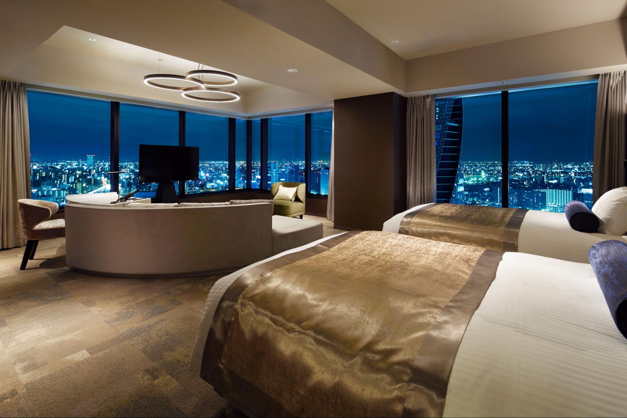 すべての客室が19階以上という贅沢なつくり。ディナーの余韻を楽しみながら、窓の外に広がる名古屋の夜景をゆったり眺める時間は格別です。