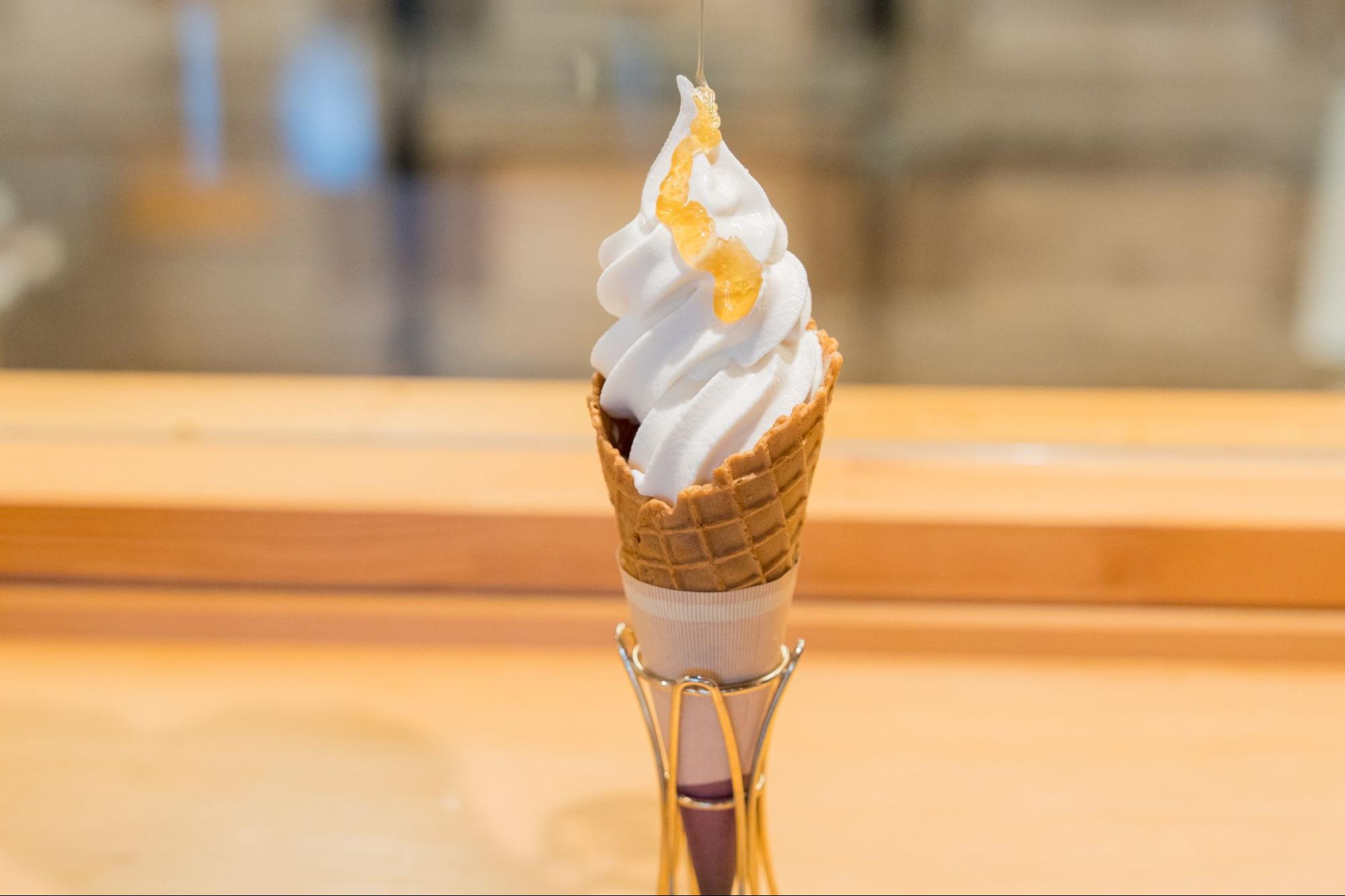 一番人気の「ミルクソフトクリーム」は、原料の中にもそよご蜂蜜を練りこみ、上からもたっぷりそよご蜂蜜をかけた贅沢な一品。蜂蜜の豊かな香りと自然な甘さが口いっぱいに広がります。