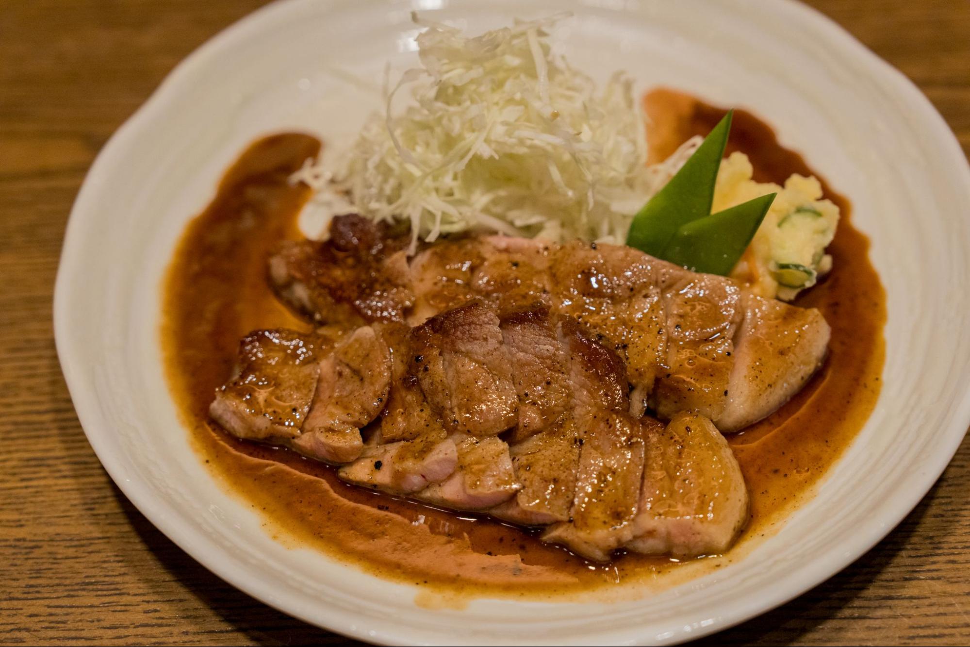 柔らかくジューシーな豚肉の旨みが際立ち、ワインの風味が絶妙にマッチした一品です。美濃焼の器で提供される料理は、目でも楽しめます。