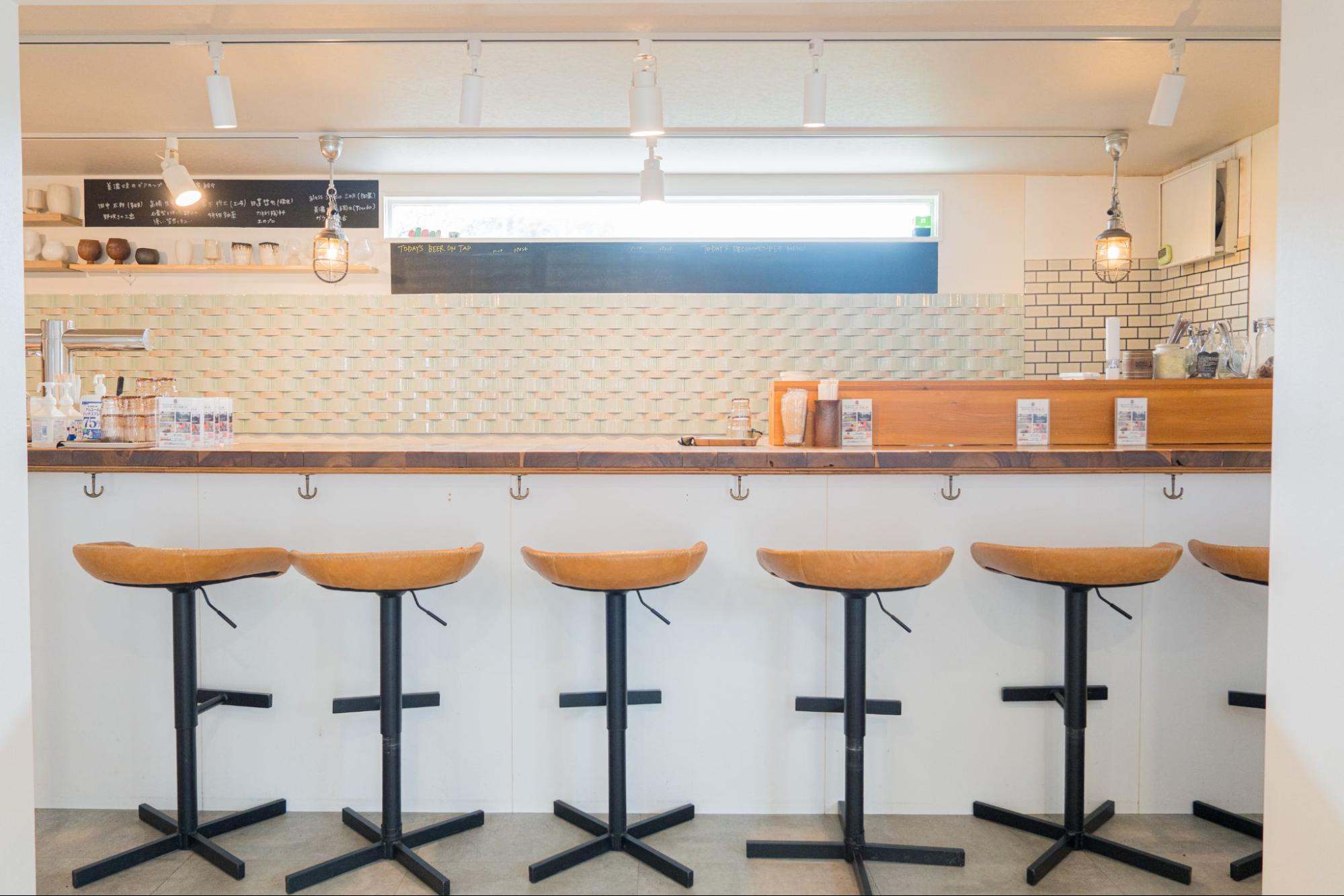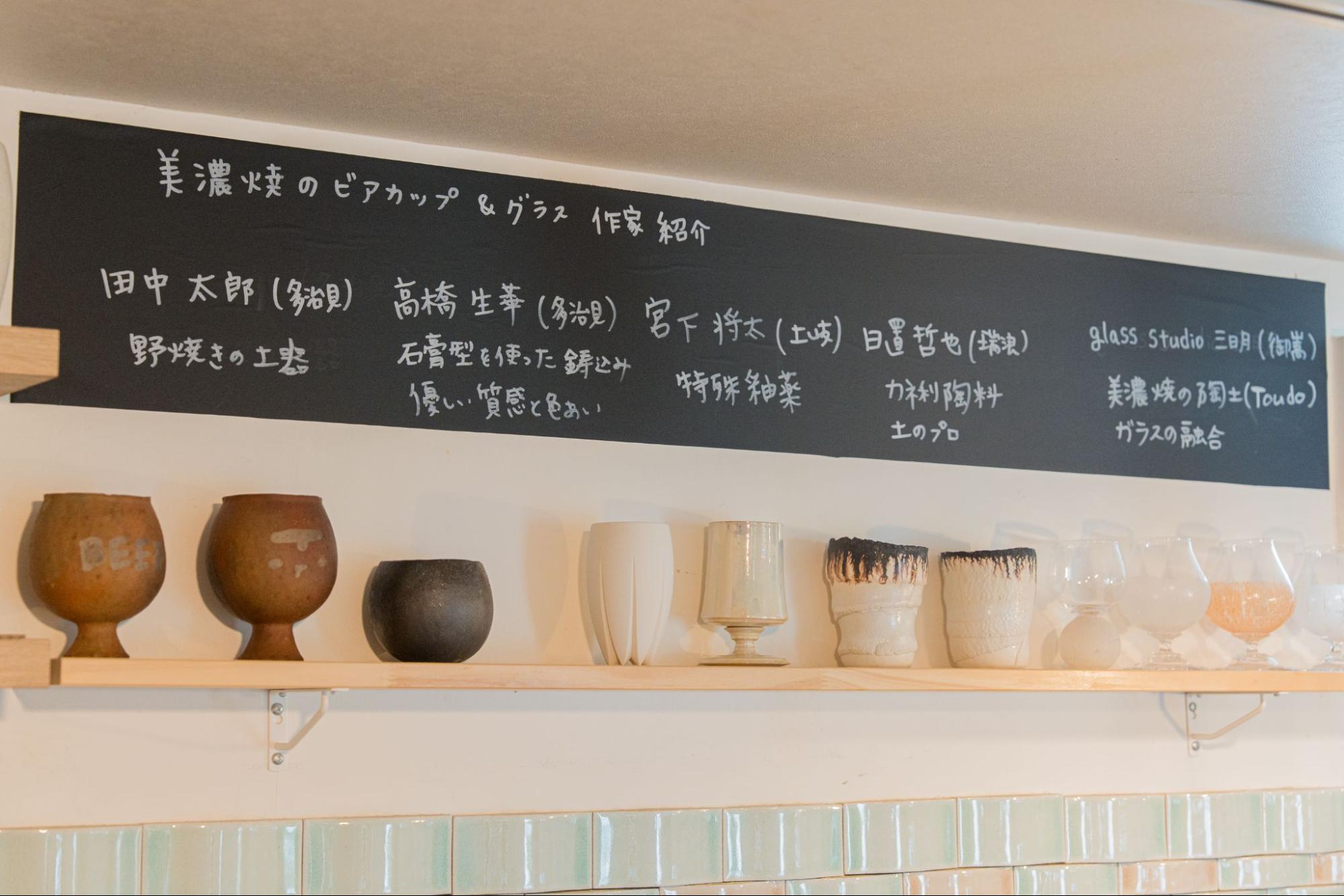 美濃焼の陶芸家とコラボしたビアカップで飲む一杯は格別。カウンター6席、ウッドデッキ8席、外テント4席×6程度で、フードのお持ち込みもOKです。