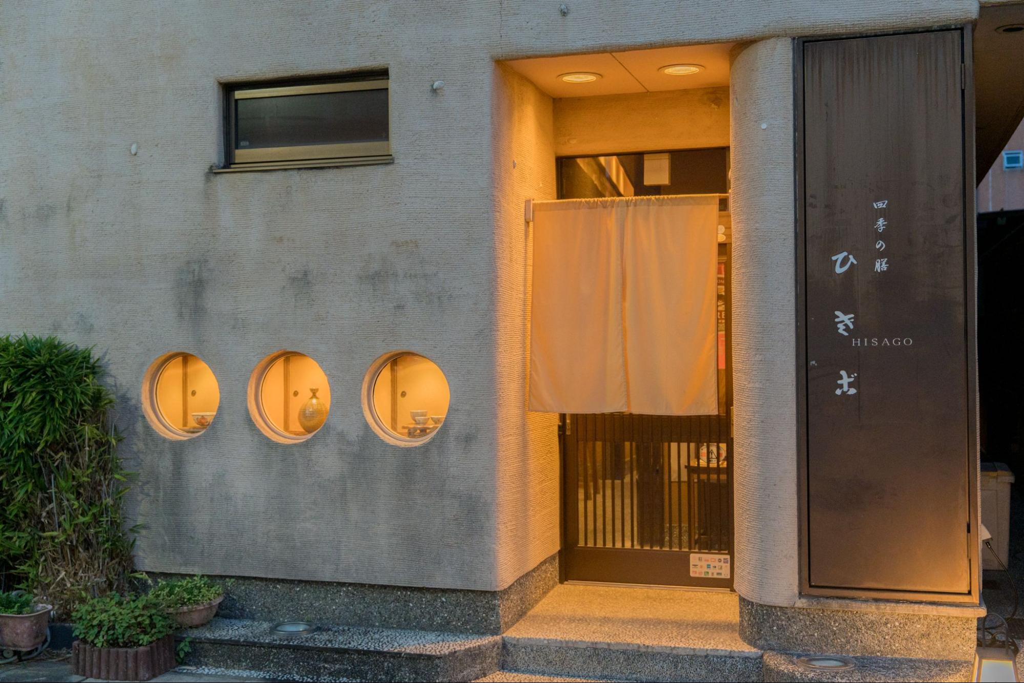 外観は白壁に丸い穴が3つ並ぶ印象的なデザイン。店内は落ち着いた大人の雰囲気で、ゆったりとした時間を楽しめます。地元客はもちろん、予約して訪れる常連も多い人気店です。
