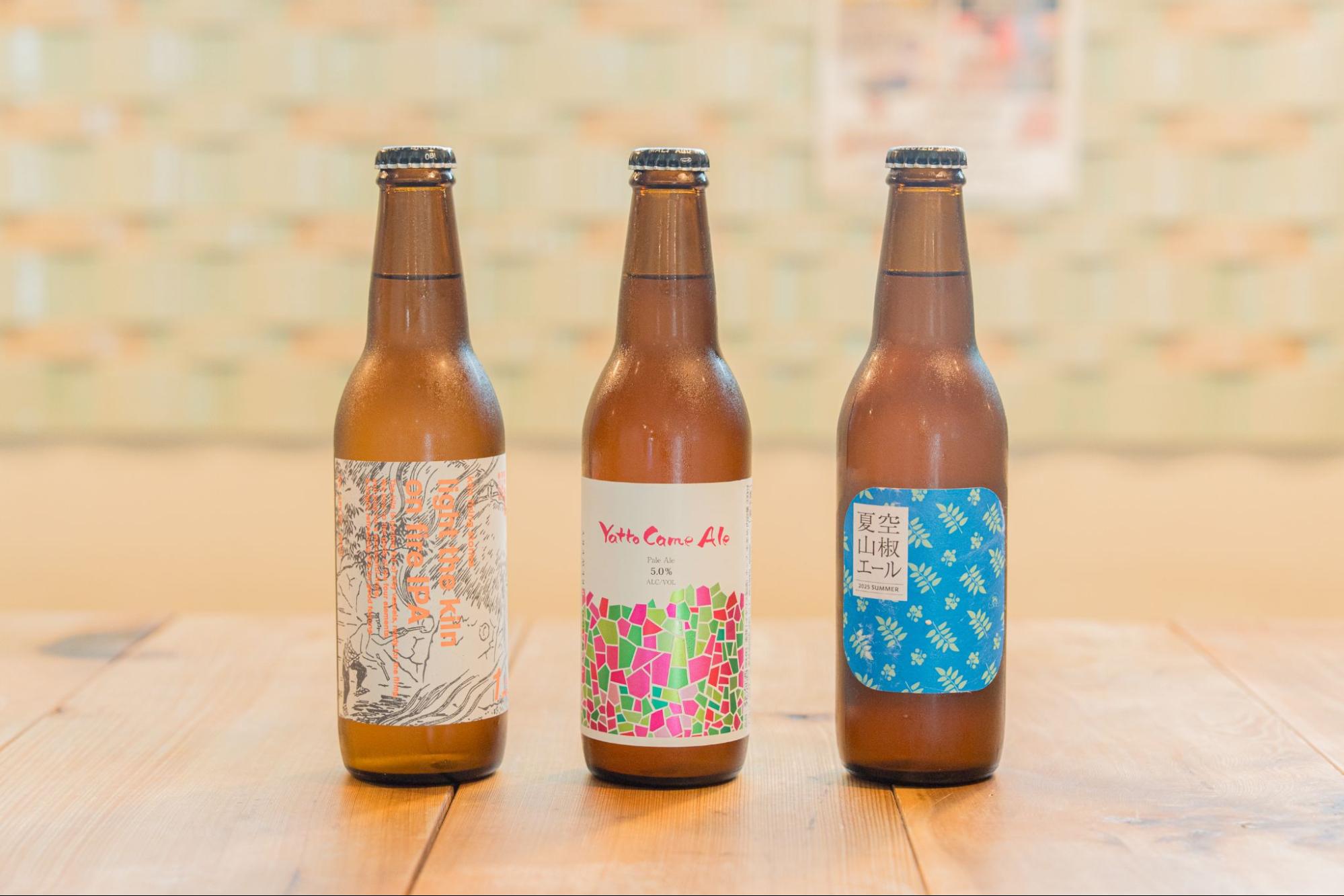 左から窯焚物語〜第一楽章〜 着火の儀IPA、Yatto Came Ale、夏空 山椒エール