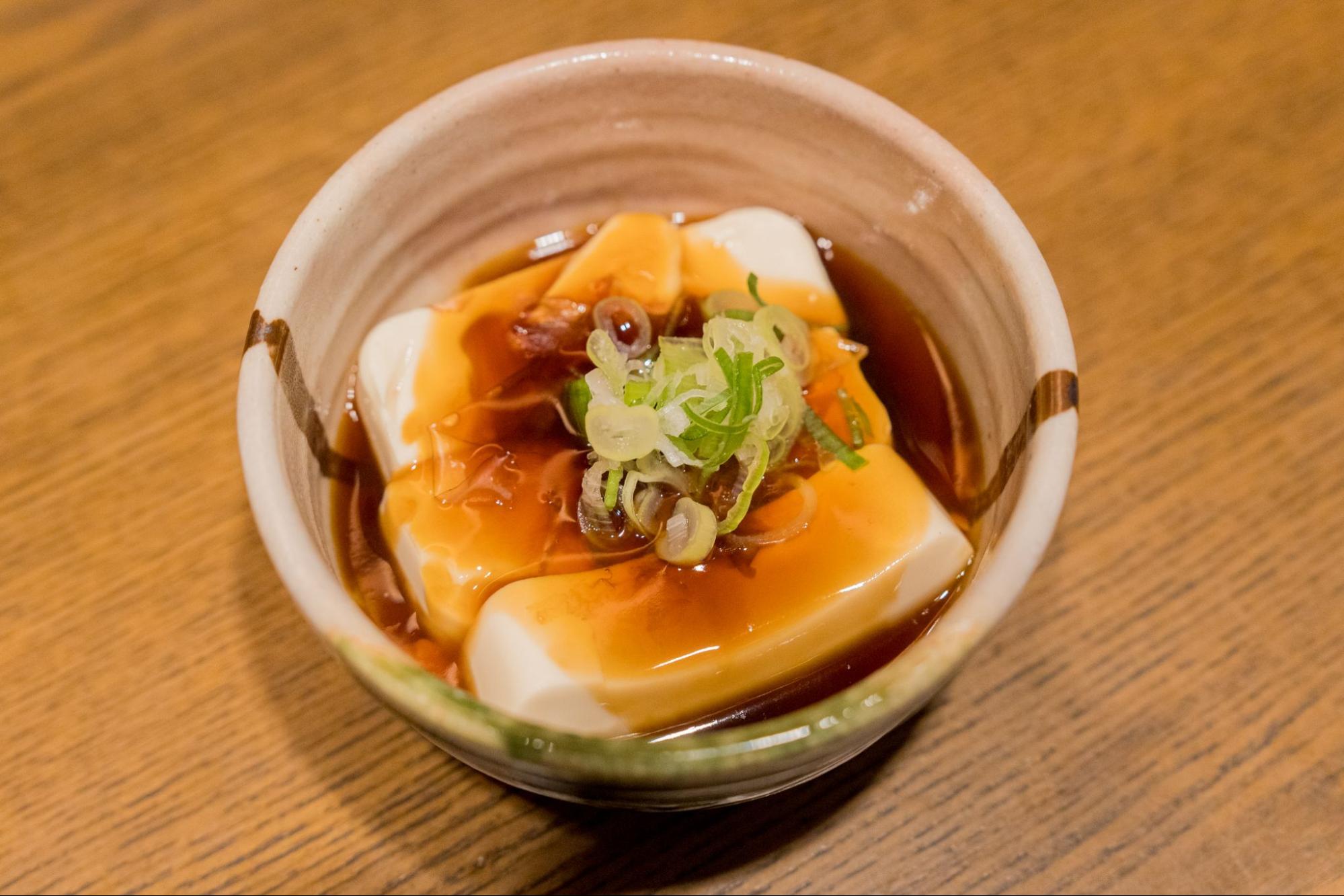 湯豆腐は、あんかけ仕立てで提供される、シンプルながらも素材の味を活かした逸品。体の芯から温まる優しい味わいで、創業以来変わらぬ人気を誇ります。