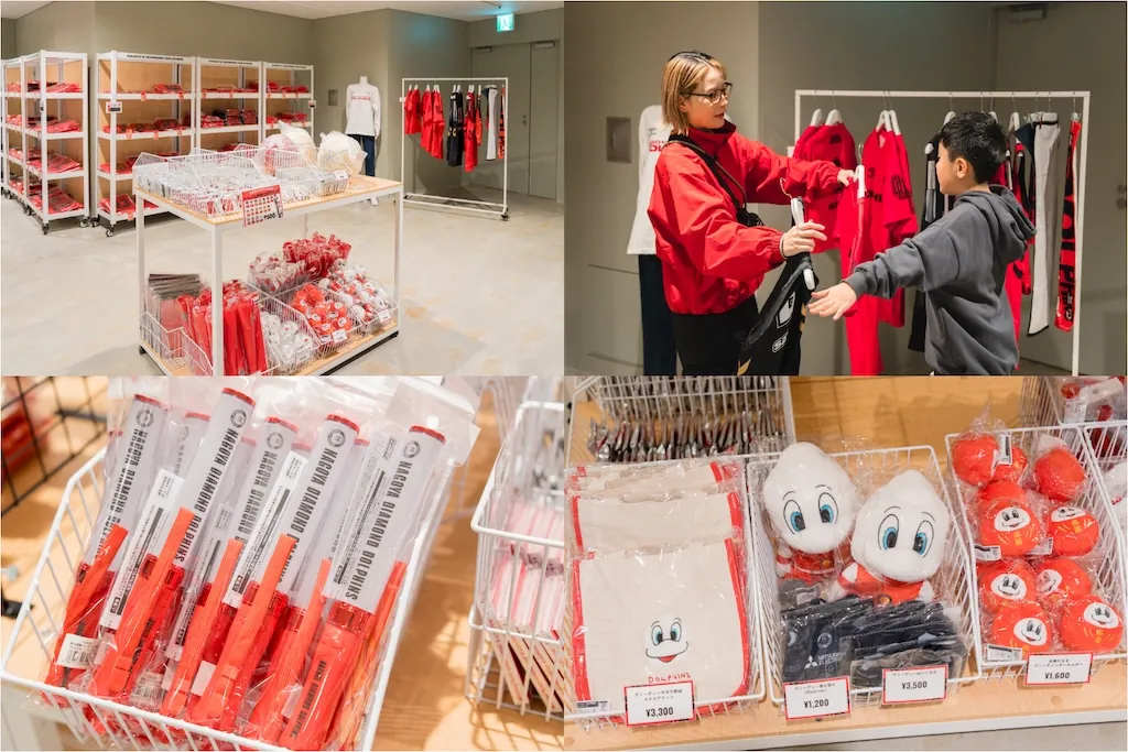 定番のタオルやユニフォームはもちろん、会場には応援気分を盛り上げてくれるさまざまなドルフィンズグッズがそろっています。