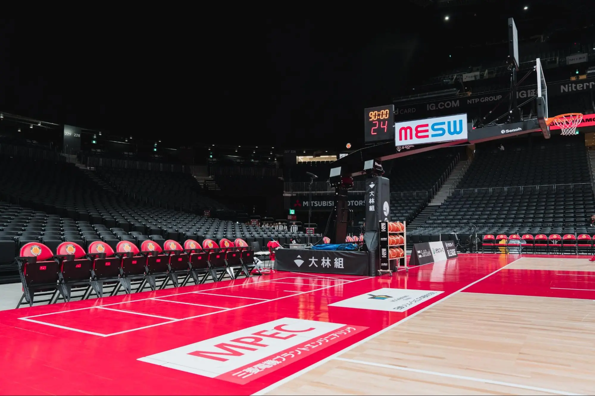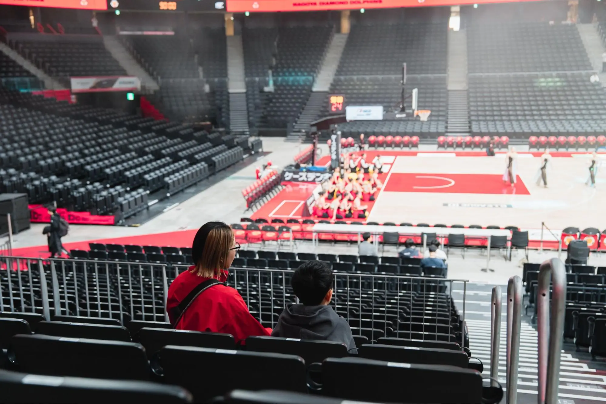 ゴール下の激しい攻防や選手ベンチの様子を間近で楽しめます。ボールが客席に飛び込んでくることもあるほどの近さです。
