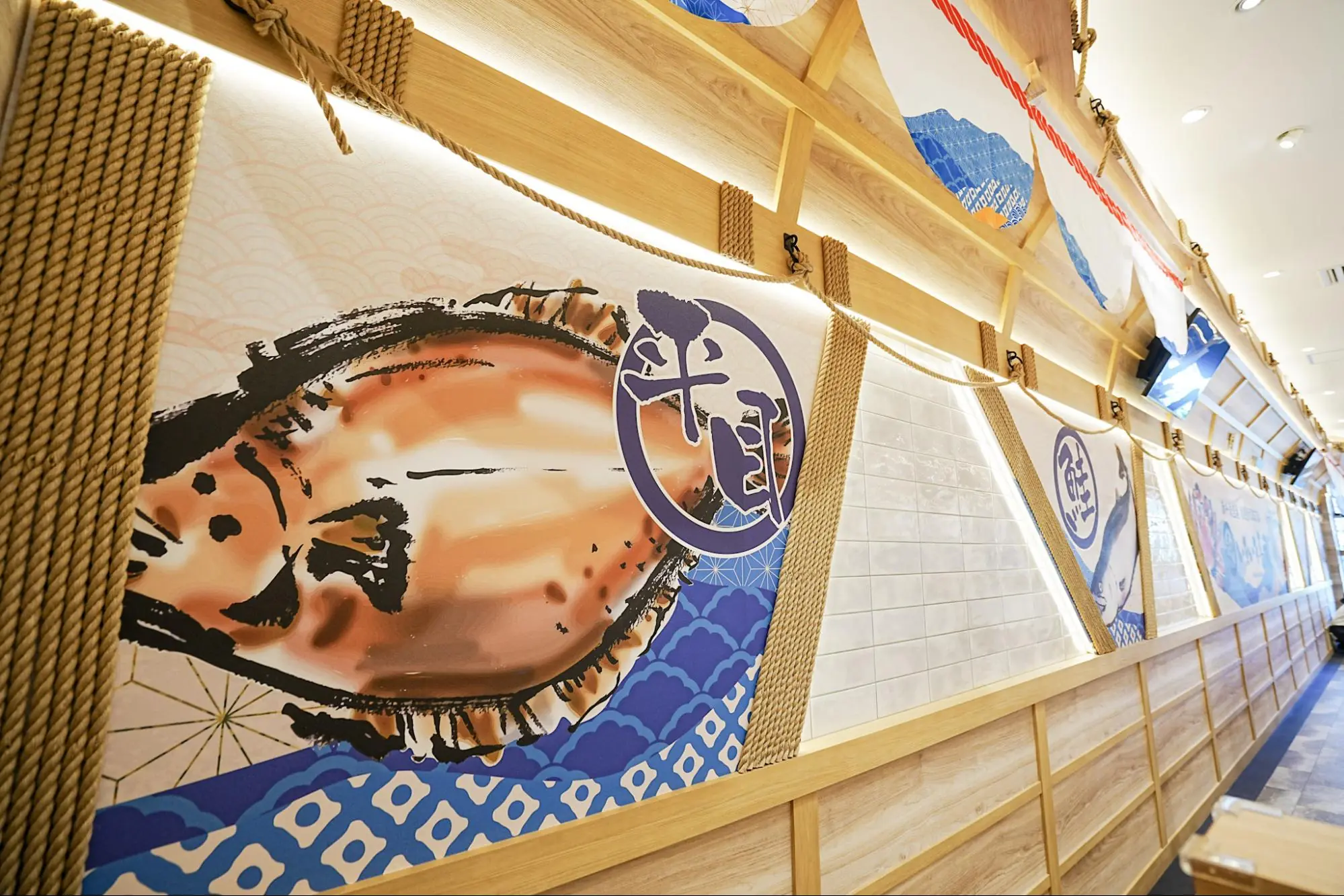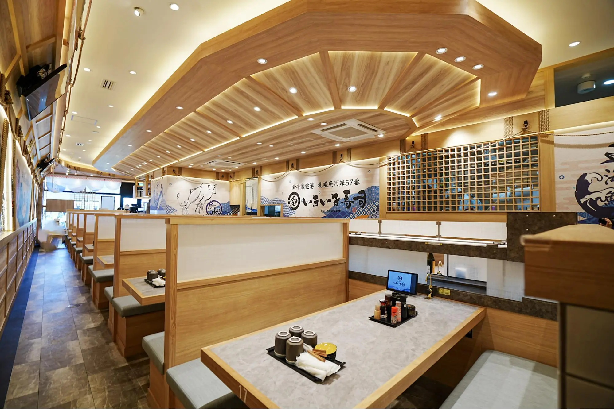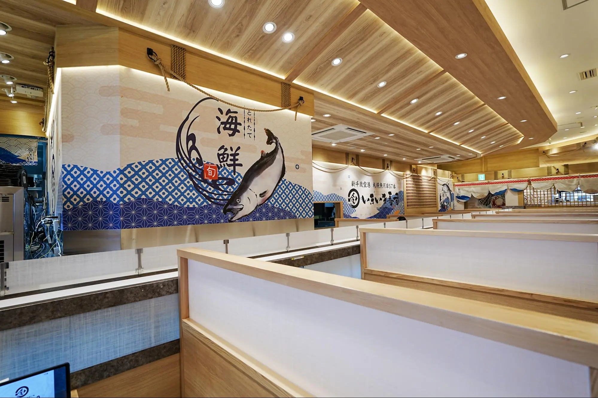 店内は明るく清潔感のあるデザイン。仕切りのある座席はゆったりとしていて、家族連れや友人同士でも過ごしやすい印象。壁には大きなロゴと波柄のデザインが施され、北海道の海を思わせる爽やかな空間になっています。