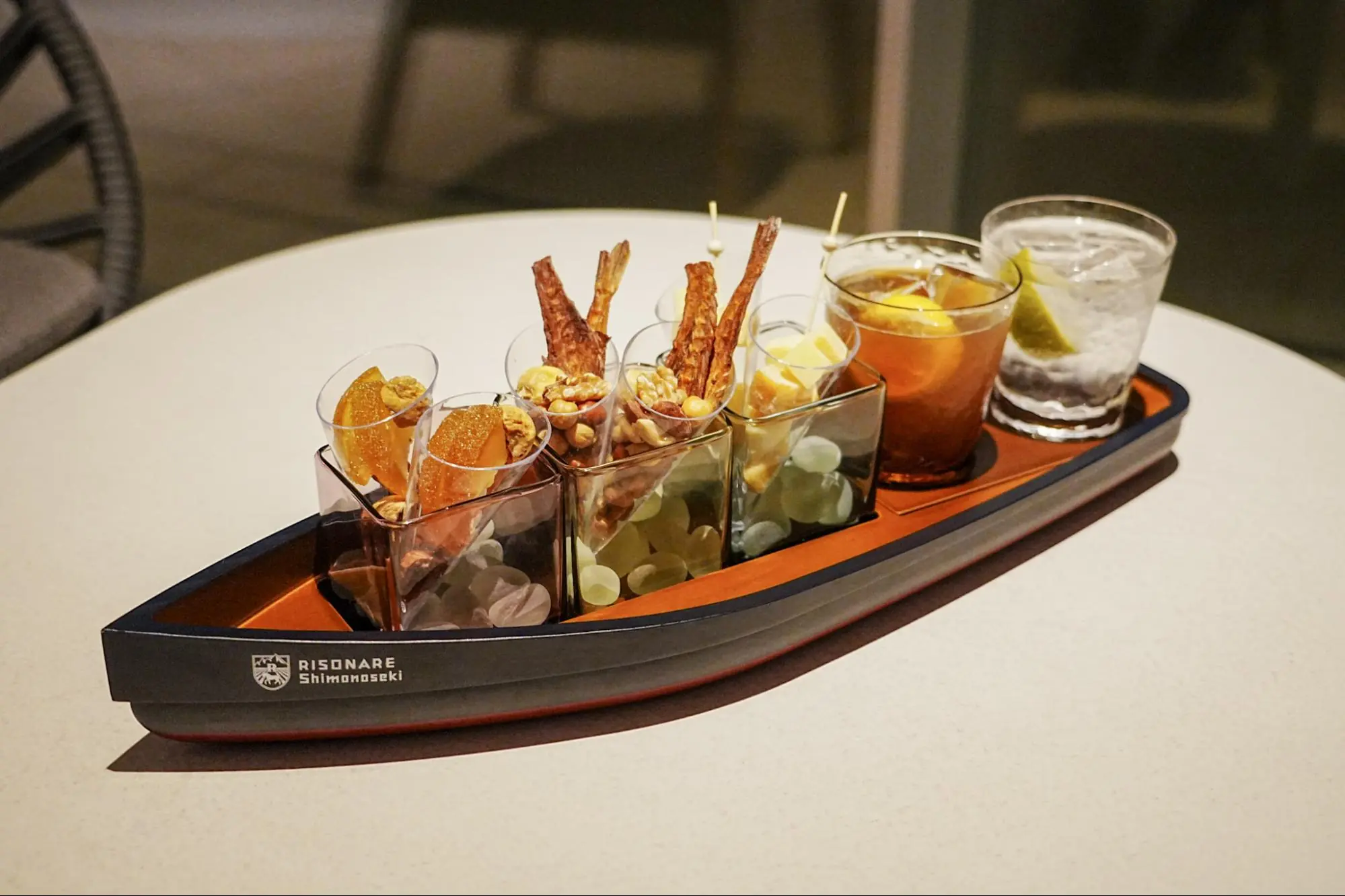 おすすめはコンテナ船をイメージした「海峡ナイトラウンジセット」。コンテナに見立てたカラフルな器に盛られたおつまみやカクテルなど、フィンガーフード3種とドリンク2杯がセットになっています。