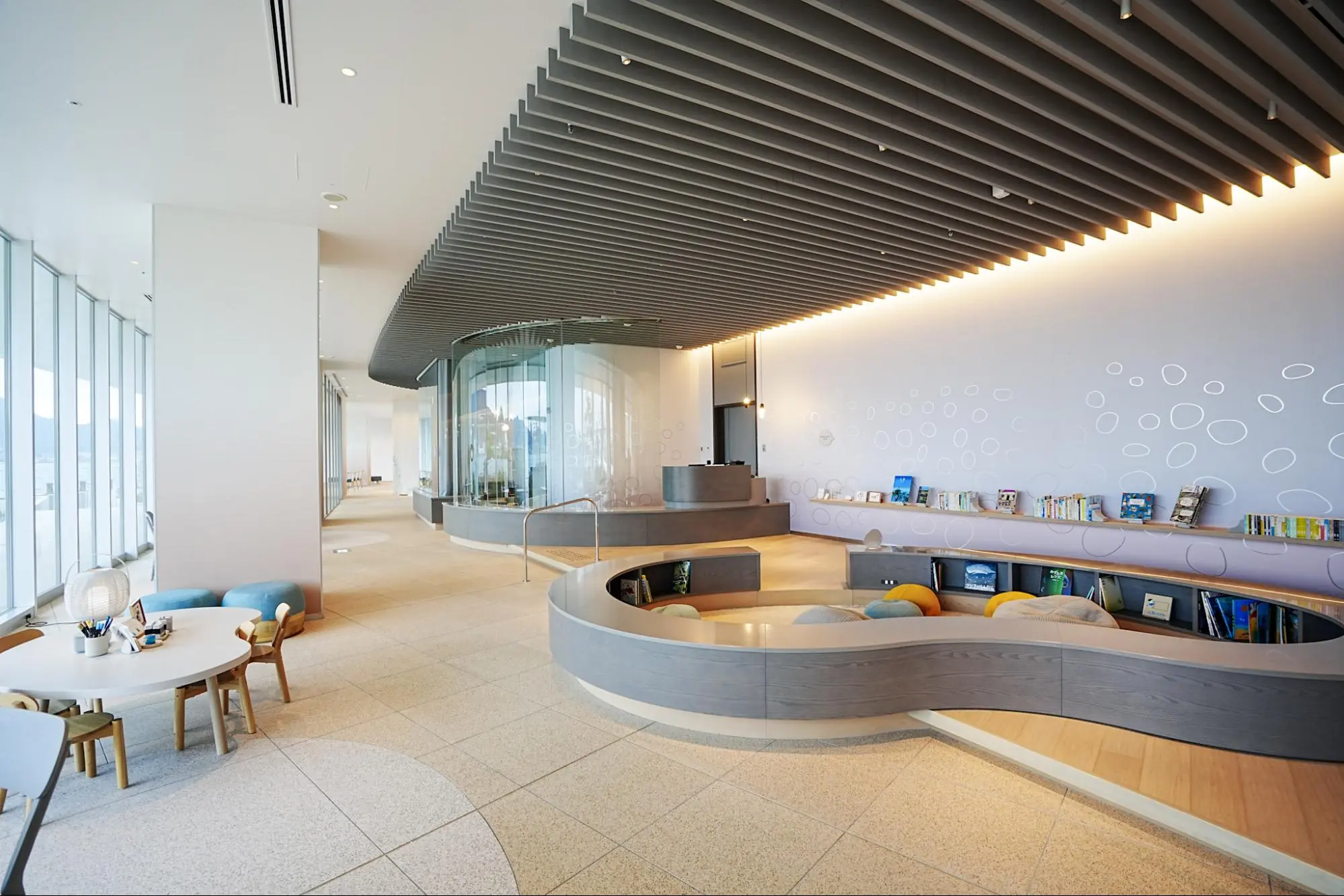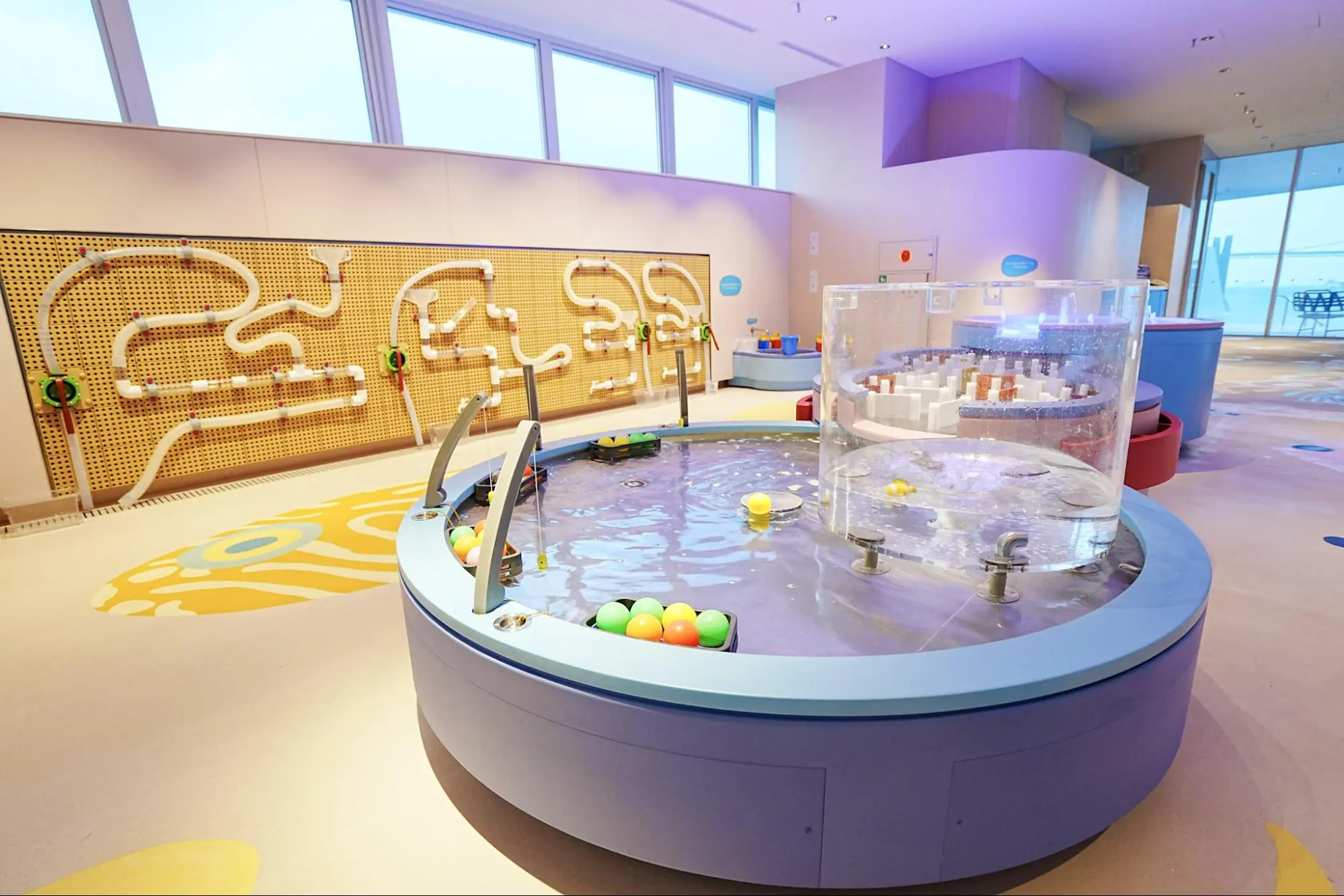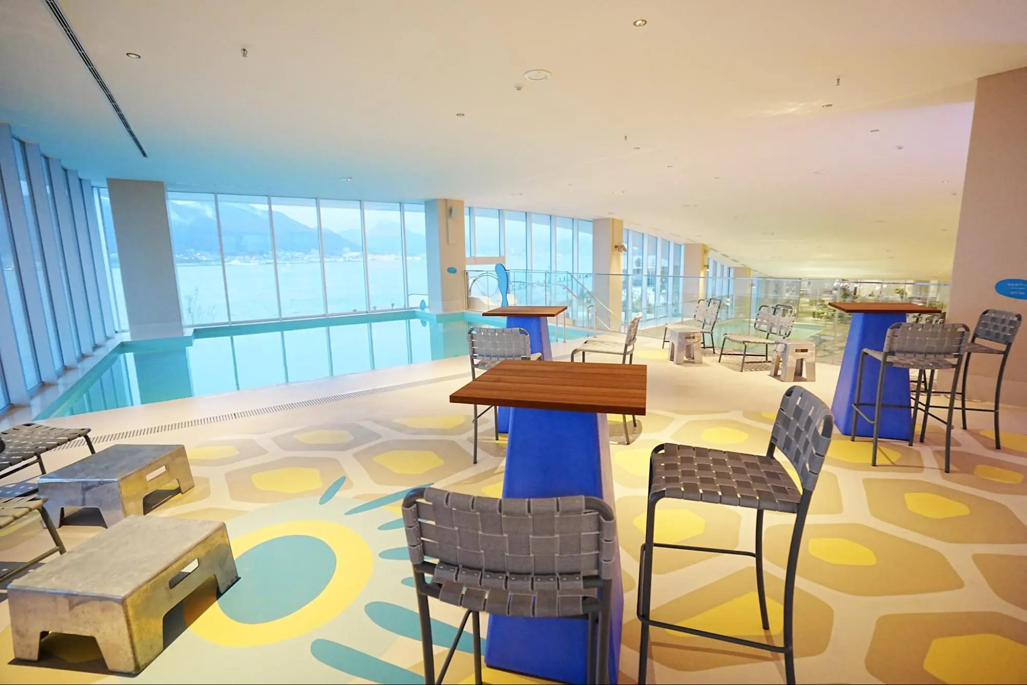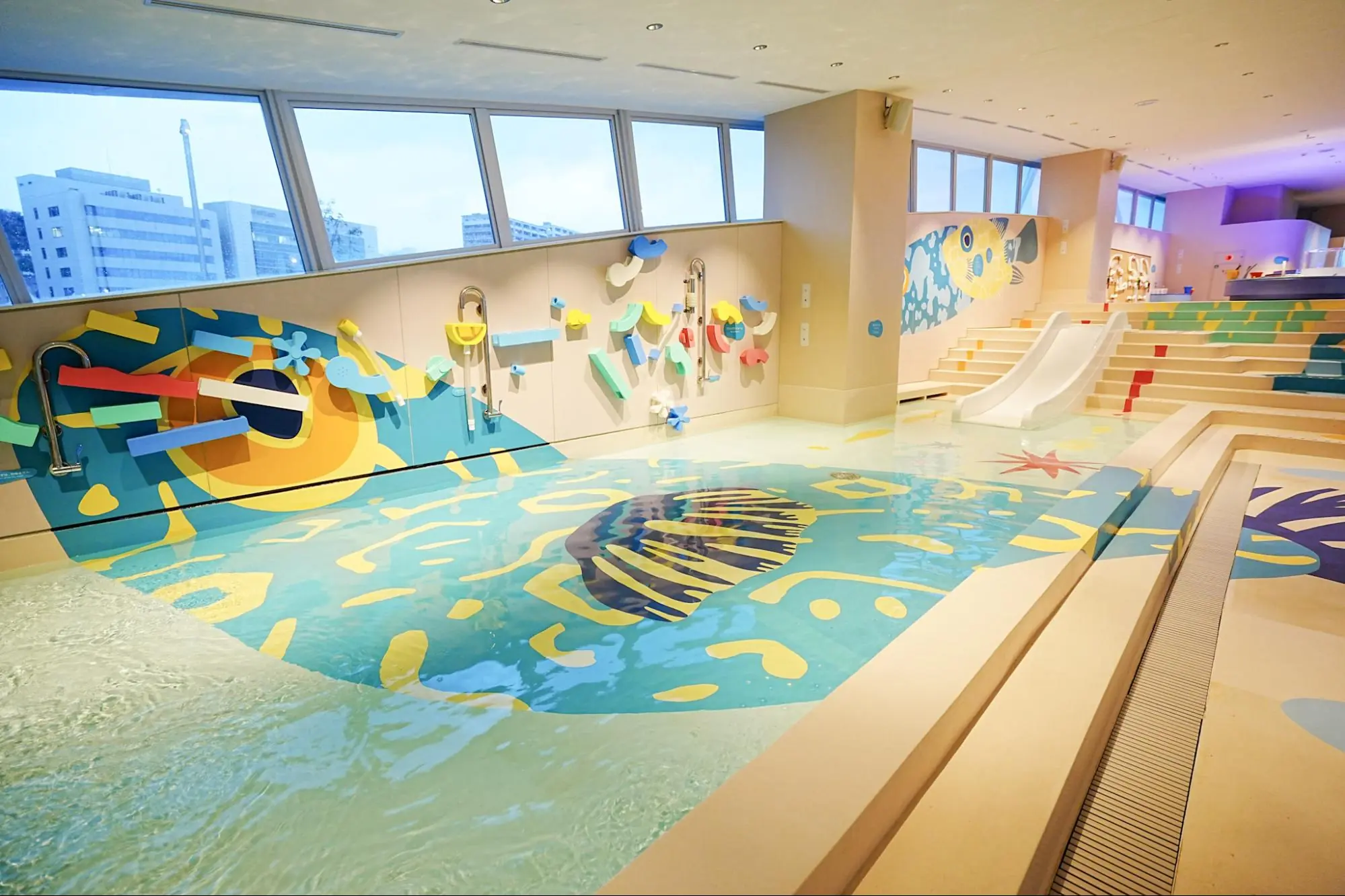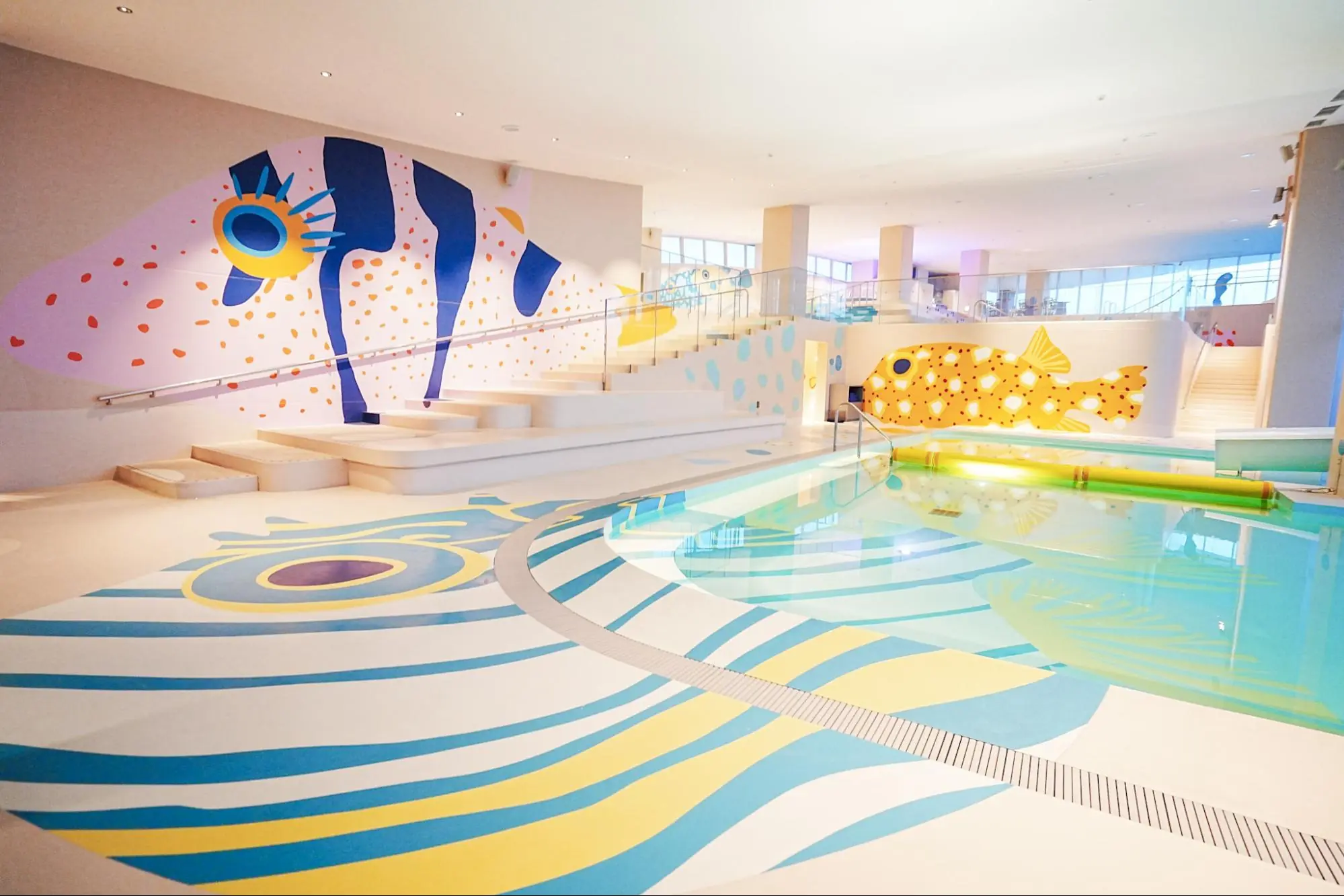 リゾナーレ下関には2つの特徴的なプールがありますが、まずは屋内にある「ふぐプール」へ。 名前の通り、下関の名産「ふぐ」をモチーフにしたデザインが散りばめられた、遊び心満載の空間です。