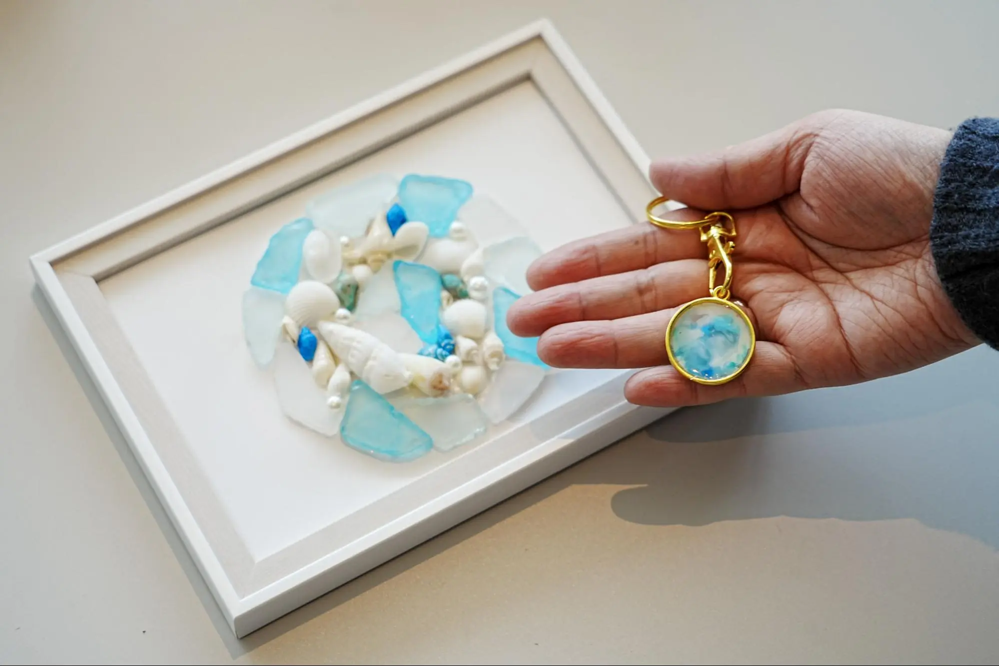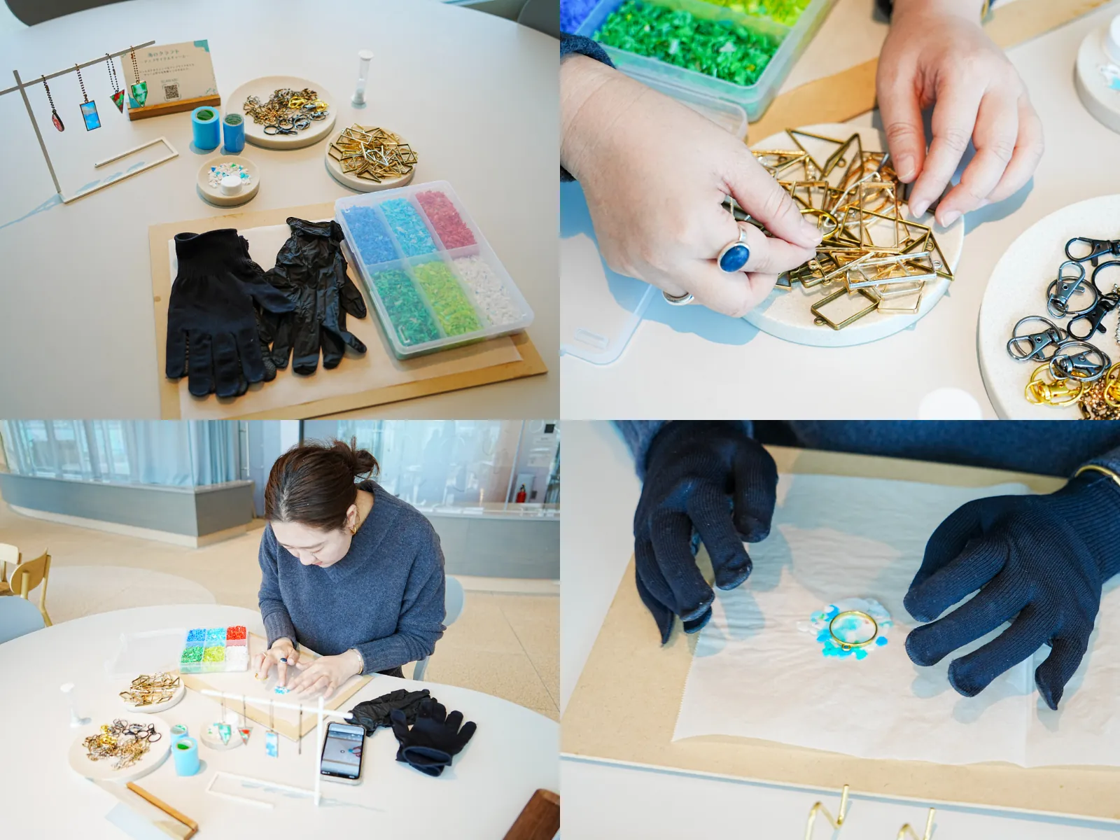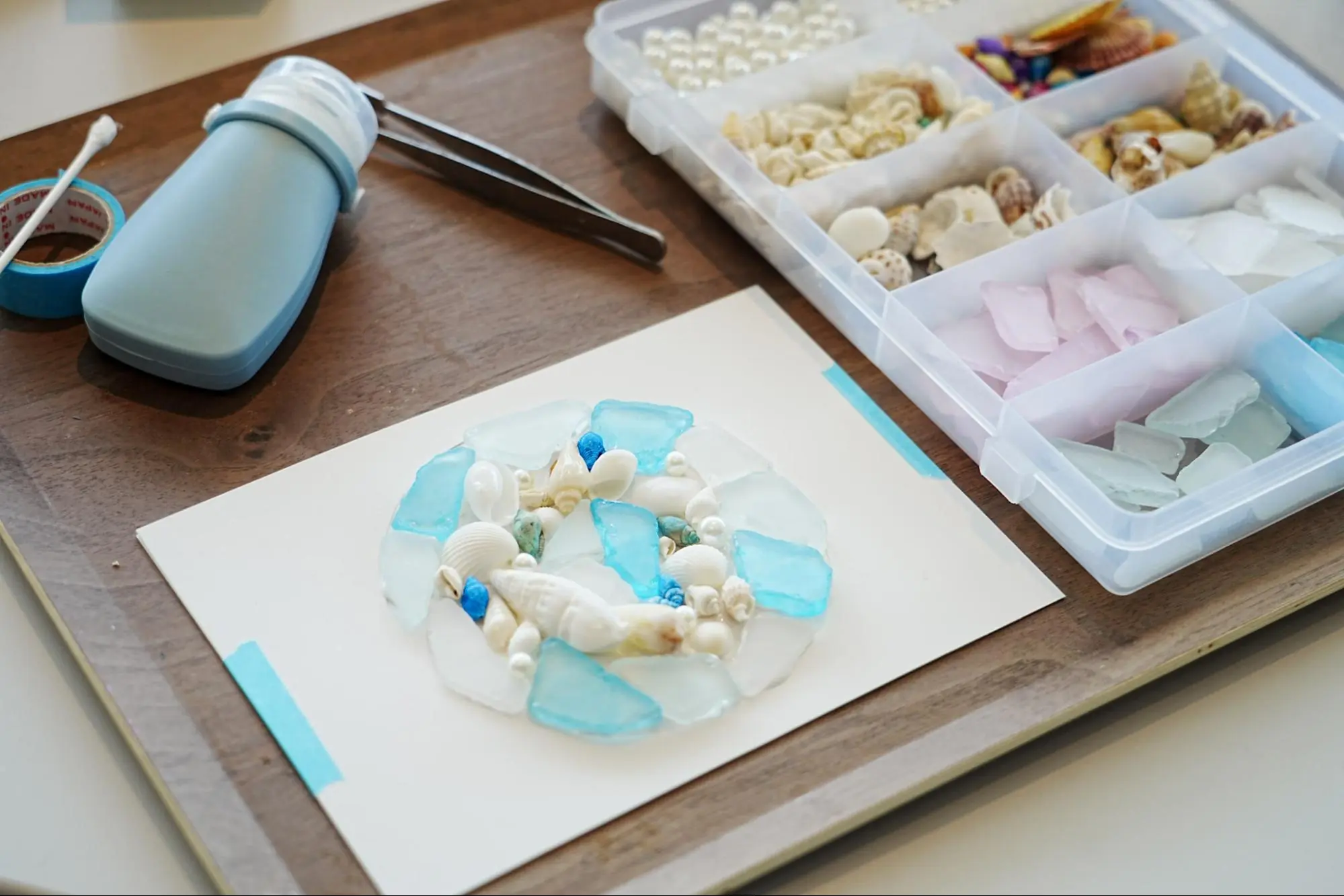 ペットボトルキャップをアップサイクルしたオリジナルチャーム作り「海のクラフト ~アップサイクルチャーム~(体験料¥800)」、貝殻やシーグラスを使って世界で一つだけのオリジナルアート「海のクラフト ~シェルコラージュ~(体験料¥2,000)」の2種類を体験できます。(どちらも予約不要)