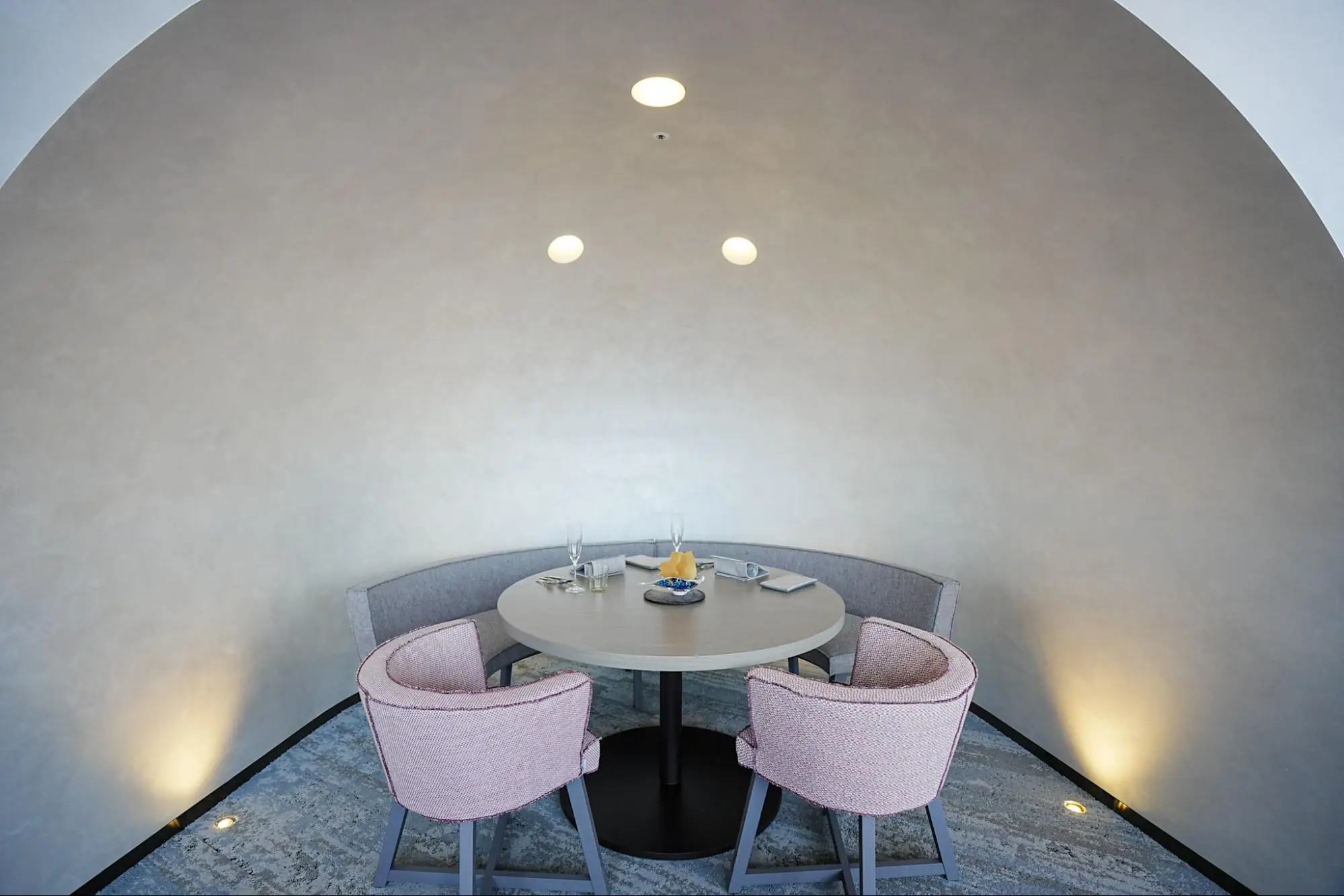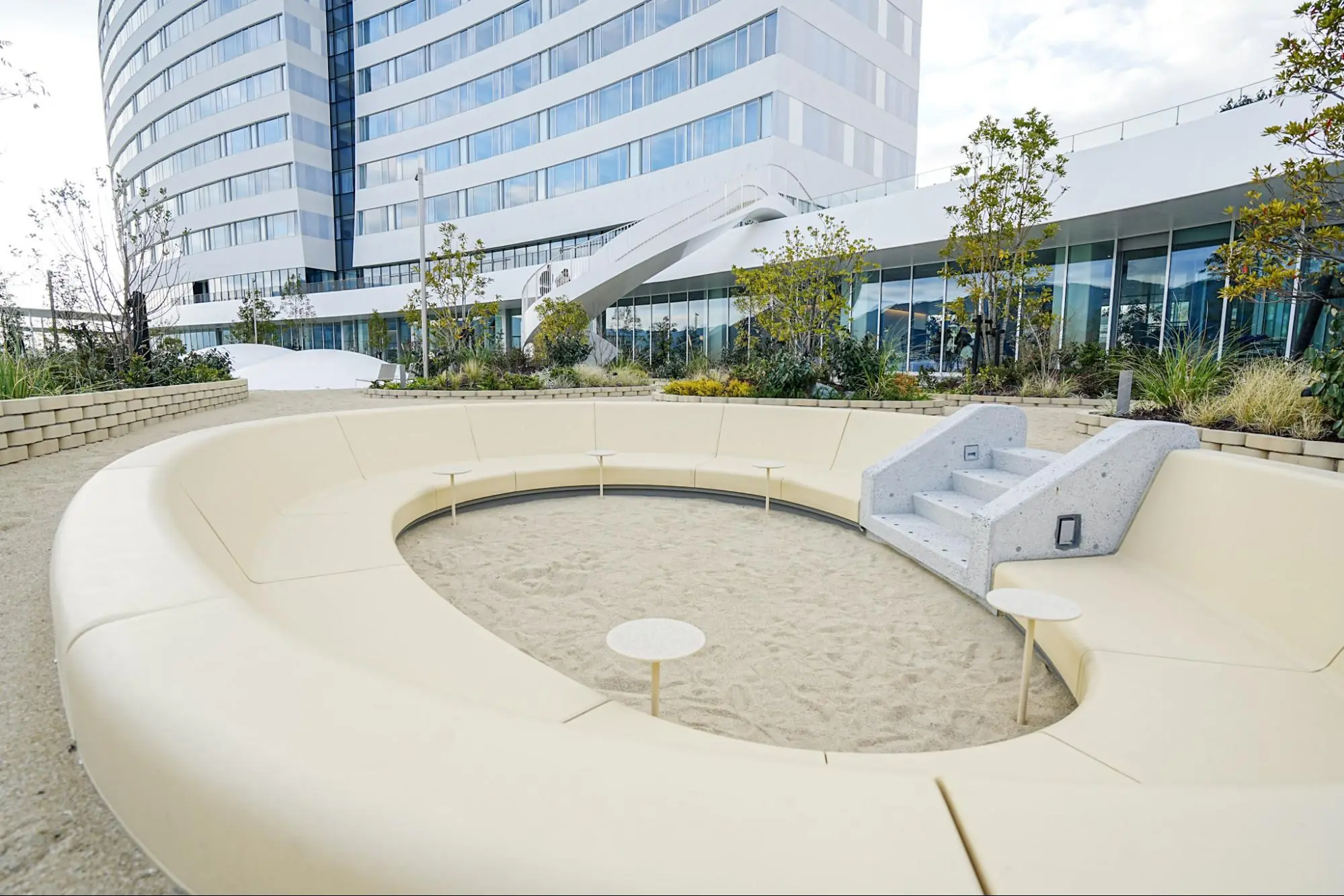 白い砂浜には、地面を掘り込んだようなユニークなソファ席が。すっぽりと砂に埋もれるように座ると、目線の高さには海と空だけ。まるで砂丘の隠れ家にいるような安心感に包まれます。