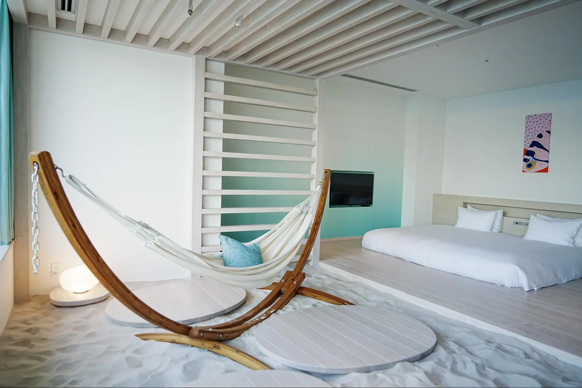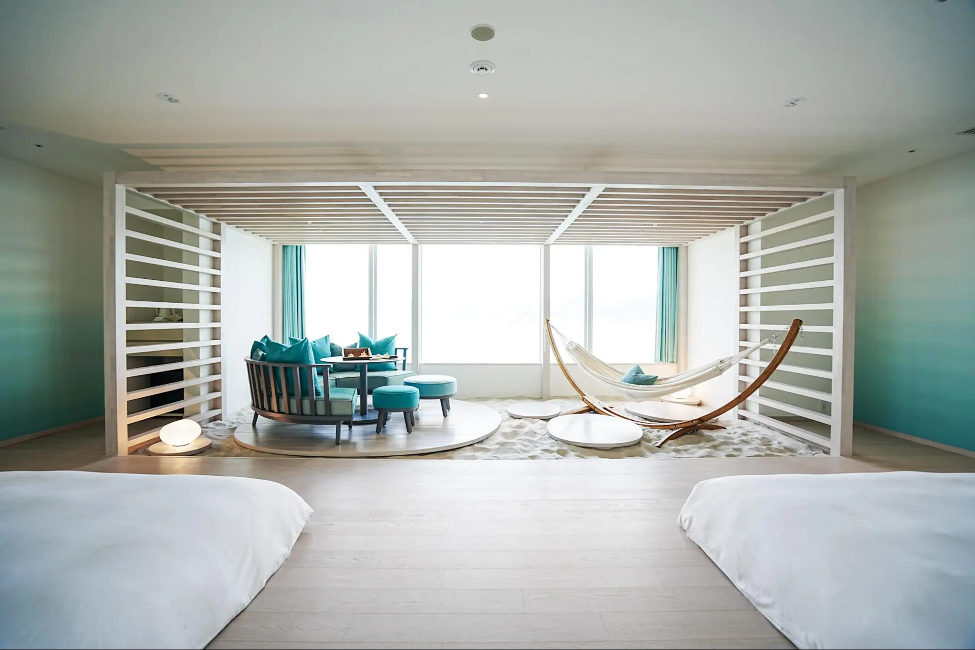 今回宿泊したのは、「海峡カバナスイート」。ドアを開けた瞬間、目に入るのは白い砂と海を感じるインテリア。部屋の中なのに、まるでプライベートビーチにいるかのような開放感です。