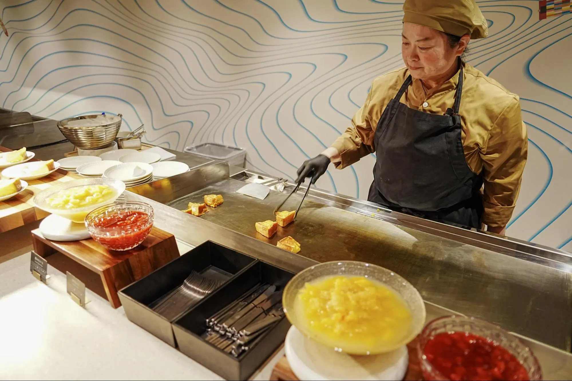 朝食はビュッフェダイニング「PUKU PUKU」へ。海宝丼、瓦そば、柑橘を使用したフレンチトーストなど、この地域ならではのメニューが並びます。