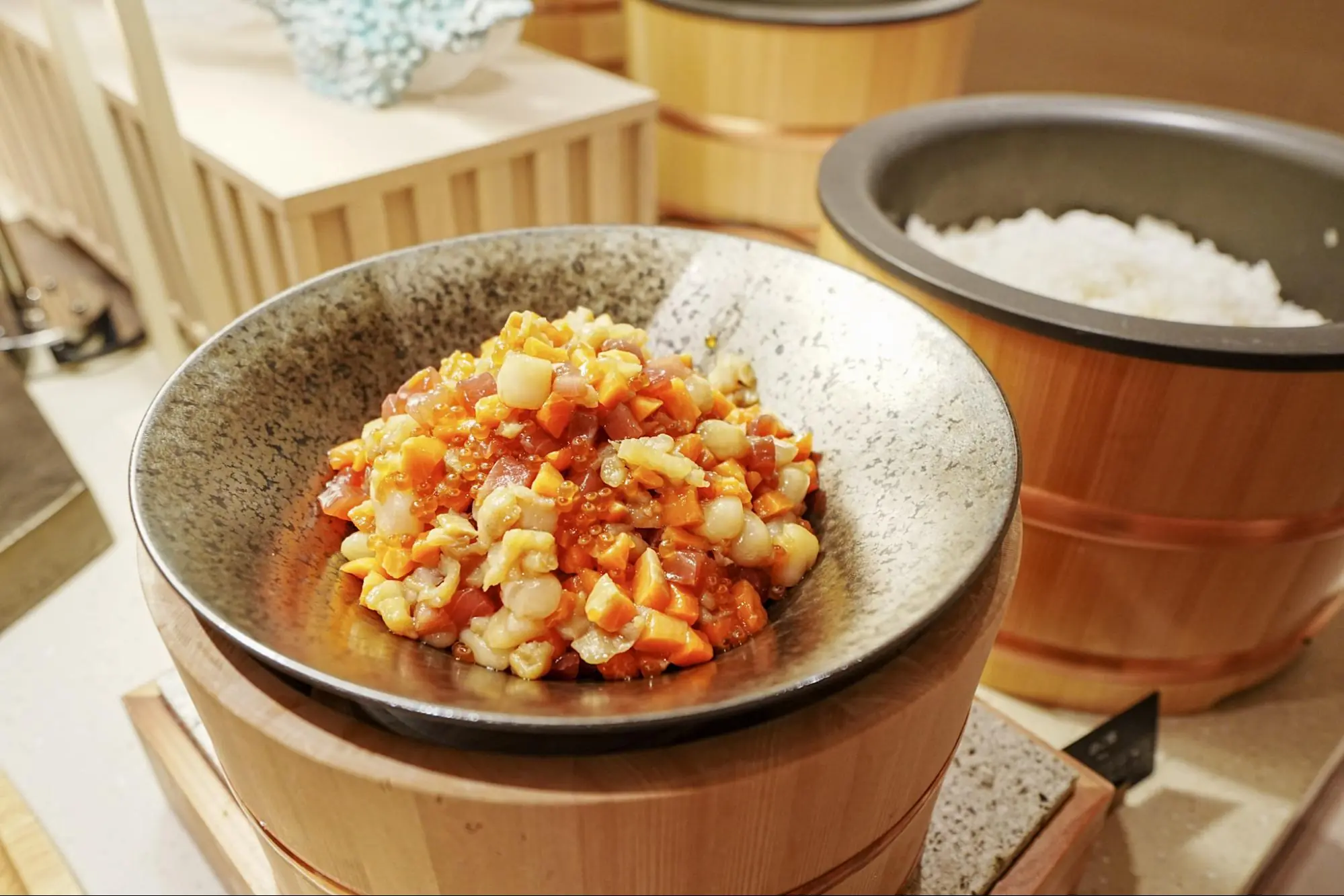 まずは名物の「海宝丼」。 新鮮なフグ、マグロ、サーモン、いくらなど、海の幸を自分好みにトッピングできる贅沢な丼です。