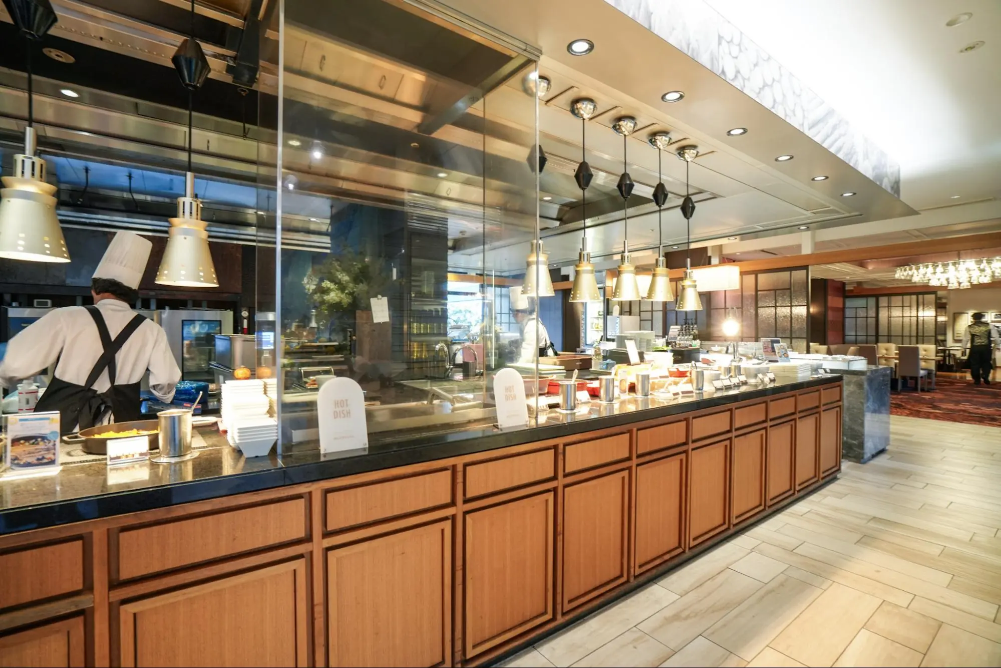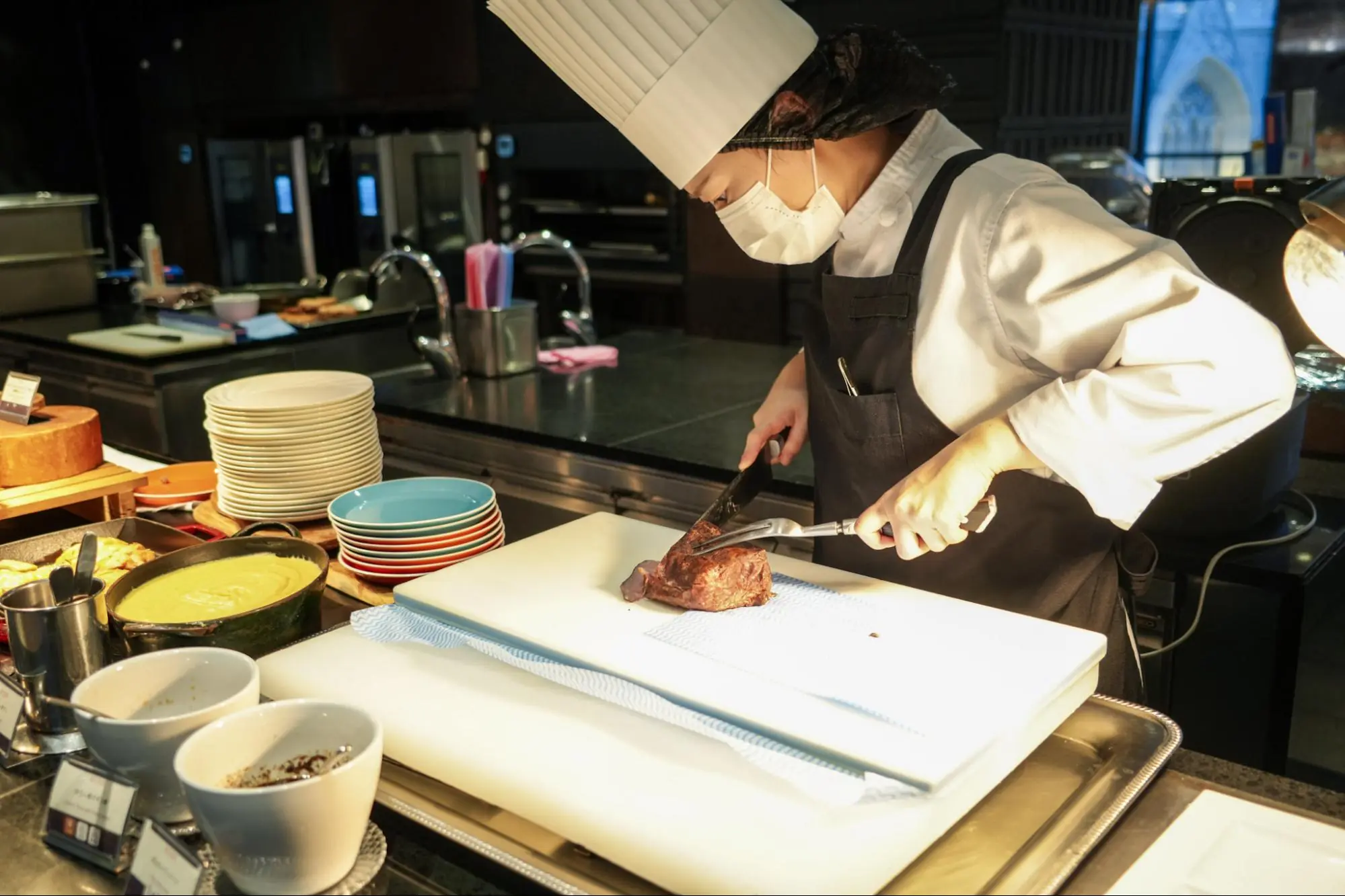 ホテル2階の「シェフズライブキッチン」は、その名の通り シェフが“ライブ”で調理するブッフェスタイル が最大の魅力。臨場感あるパフォーマンスと、出来立ての香りが五感を刺激します。華やかなブッフェ台は、地中海料理や季節のいちごスイーツで彩られ、ワクワク感たっぷりです。