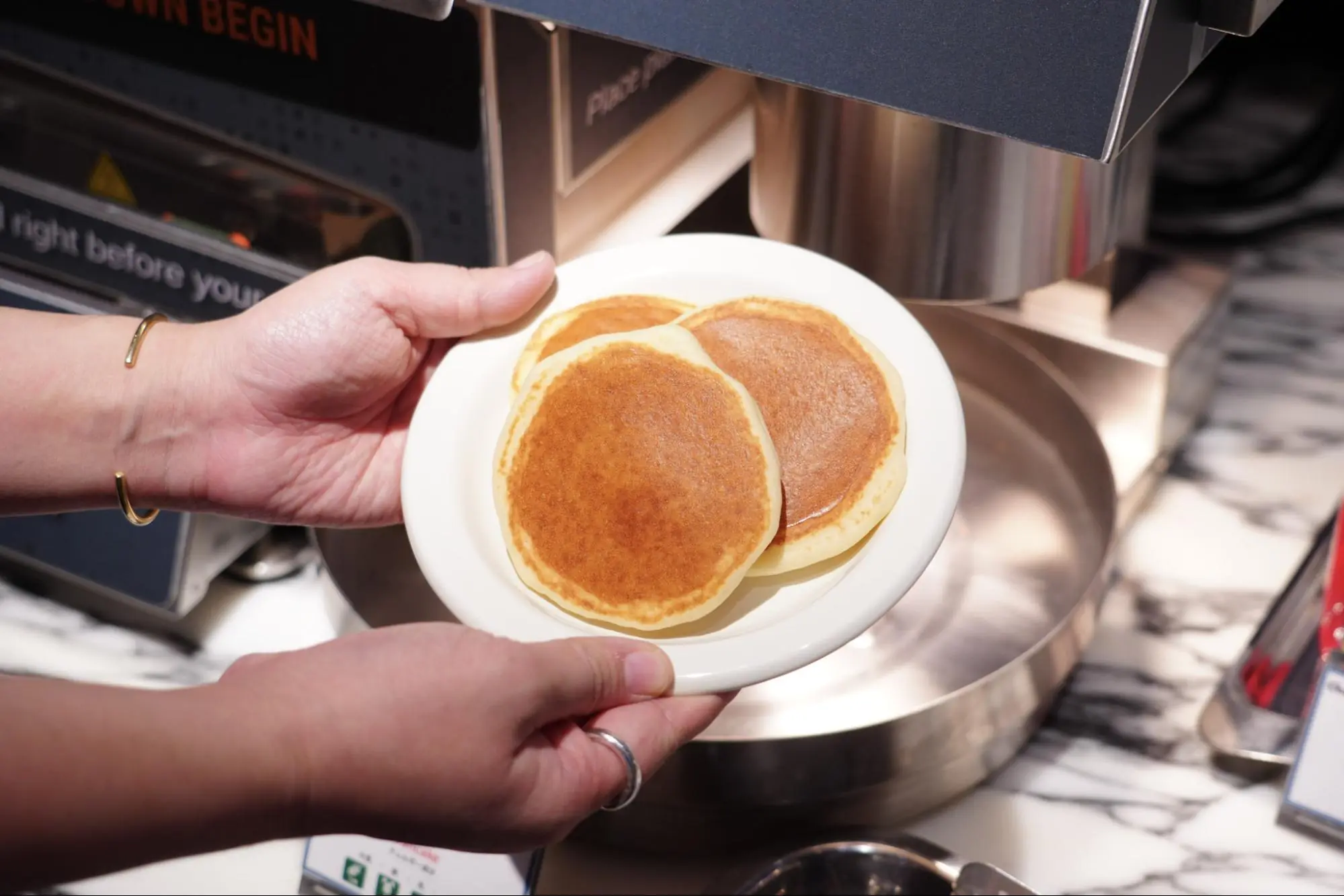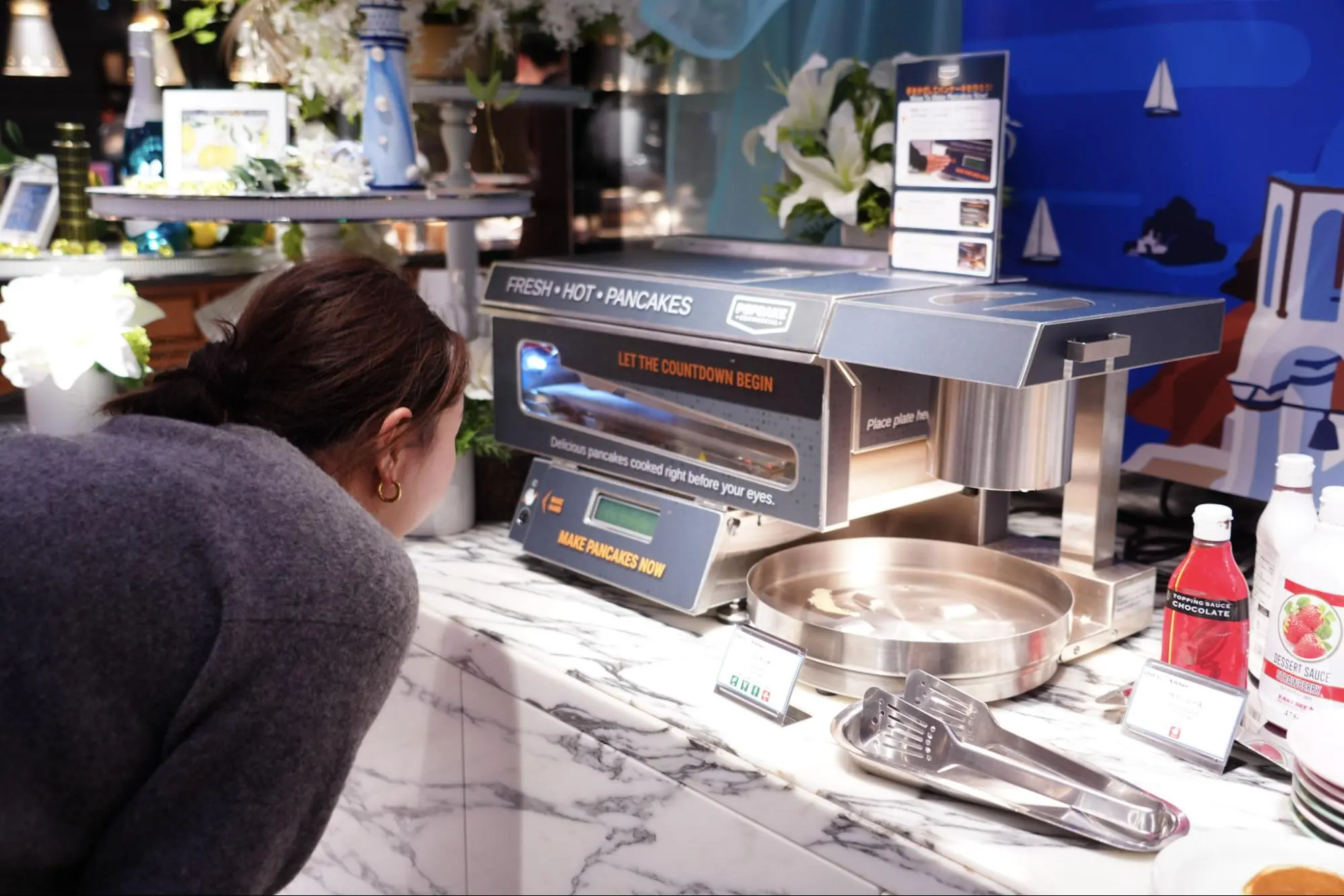 お子さんに大人気なのが、パンケーキマシーン!センサーに手をかざすと、できたてのパンケーキが自動でつくれます。