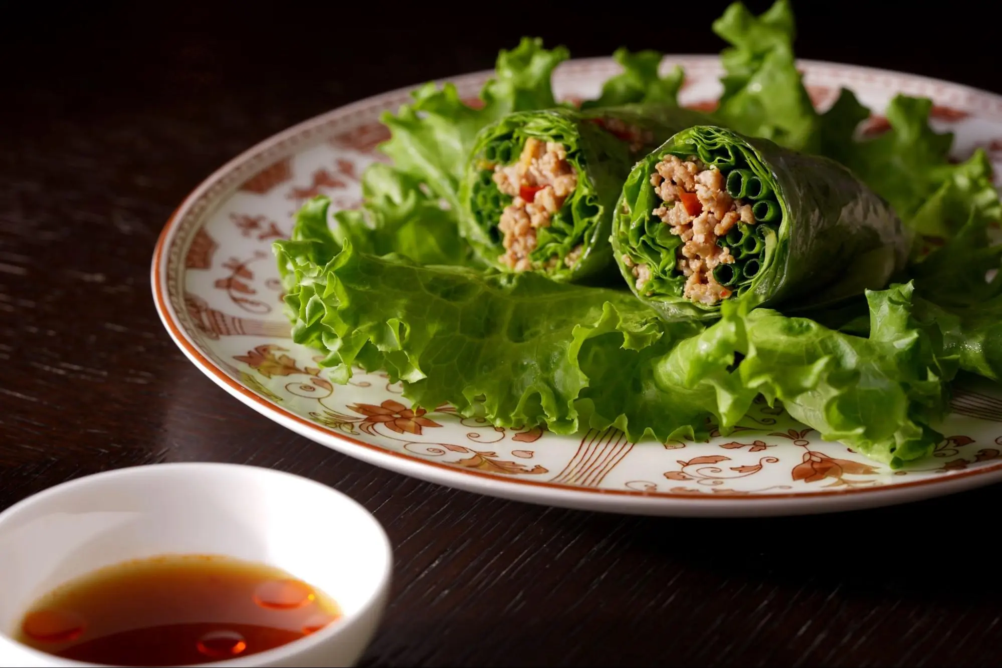 ザ・コンダーハウスで人気の生春巻きと台湾ミンチを合わせた1品。唐辛子の辛味とニンニクの旨味を感じられ、辛いものをお野菜で包んで食べるアジアンなメニューです。