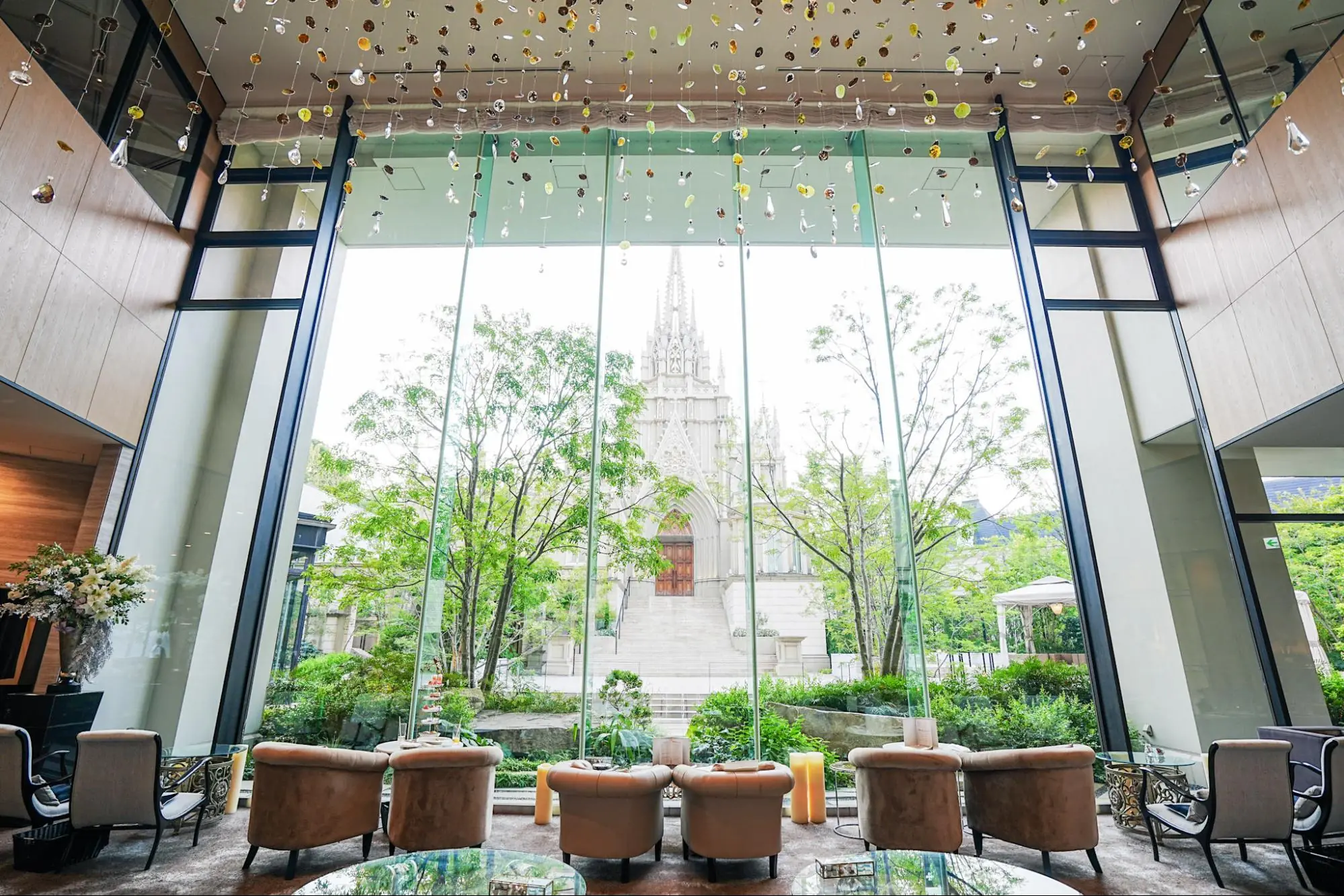荘厳な大聖堂を臨む光が差し込む大きな窓、シャンデリアが煌く高い天井、ゆったりとくつろげるソファ席など、優雅なラグジュアリー空間で楽しむオールデイ・アフタヌーンティーラウンジ&バーです。